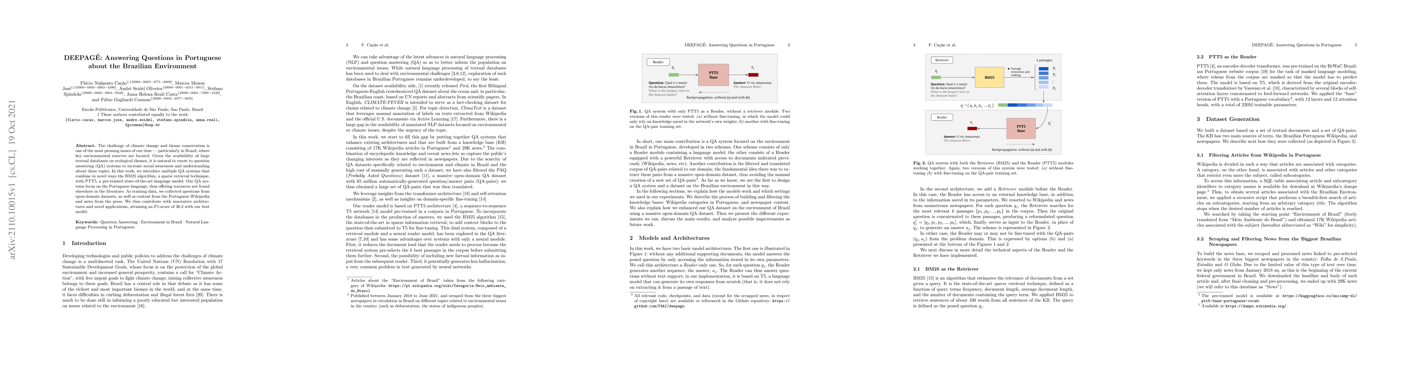 The challenge of climate change and biome conservation is one of the most pressing issues of our time - particularly in Brazil, where key environmental reserves are located. Given the availability of large textual databases on ecological themes, it is natural to resort to question answering (QA) systems to increase social awareness and understanding about these topics. In this work, we introduce multiple QA systems that combine in novel ways the BM25 algorithm, a sparse retrieval technique, with PTT5, a pre-trained state-of-the-art language model. Our QA systems focus on the Portuguese language, thus offering resources not found elsewhere in the literature. As training data, we collected questions from open-domain datasets, as well as content from the Portuguese Wikipedia and news from the press. We thus contribute with innovative architectures and novel applications, attaining an F1-score of 36.2 with our best model.