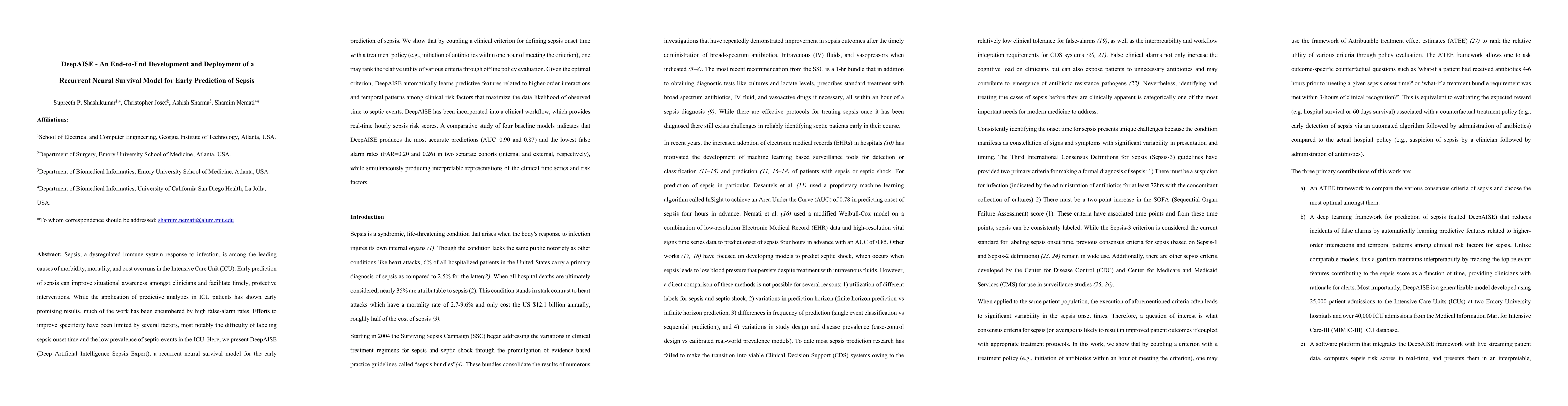 Sepsis, a dysregulated immune system response to infection, is among the leading causes of morbidity, mortality, and cost overruns in the Intensive Care Unit (ICU). Early prediction of sepsis can improve situational awareness amongst clinicians and facilitate timely, protective interventions. While the application of predictive analytics in ICU patients has shown early promising results, much of the work has been encumbered by high false-alarm rates. Efforts to improve specificity have been limited by several factors, most notably the difficulty of labeling sepsis onset time and the low prevalence of septic-events in the ICU. Here, we present DeepAISE (Deep Artificial Intelligence Sepsis Expert), a recurrent neural survival model for the early prediction of sepsis. We show that by coupling a clinical criterion for defining sepsis onset time with a treatment policy (e.g., initiation of antibiotics within one hour of meeting the criterion), one may rank the relative utility of various criteria through offline policy evaluation. Given the optimal criterion, DeepAISE automatically learns predictive features related to higher-order interactions and temporal patterns among clinical risk factors that maximize the data likelihood of observed time to septic events. DeepAISE has been incorporated into a clinical workflow, which provides real-time hourly sepsis risk scores. A comparative study of four baseline models indicates that DeepAISE produces the most accurate predictions (AUC=0.90 and 0.87) and the lowest false alarm rates (FAR=0.20 and 0.26) in two separate cohorts (internal and external, respectively), while simultaneously producing interpretable representations of the clinical time series and risk factors.