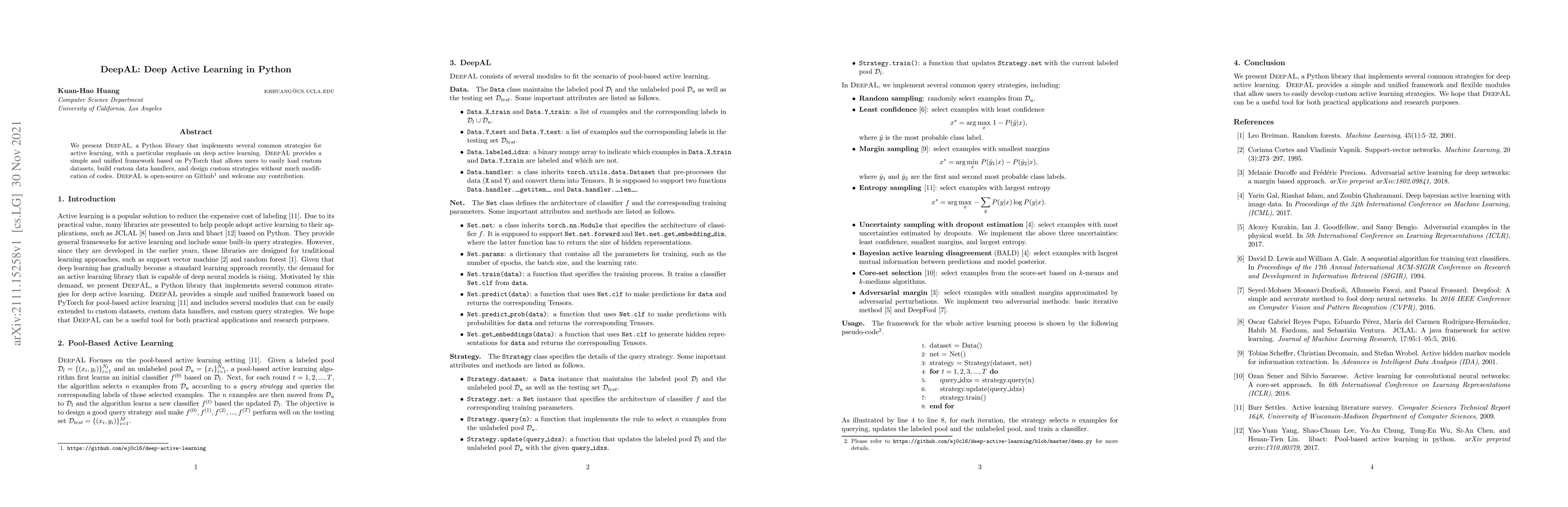DeepAL is a Python library for active learning, especially deep active learning, built on PyTorch. It offers a unified framework for easy dataset loading, custom data handlers, and strategy design, and is open-source on GitHub.