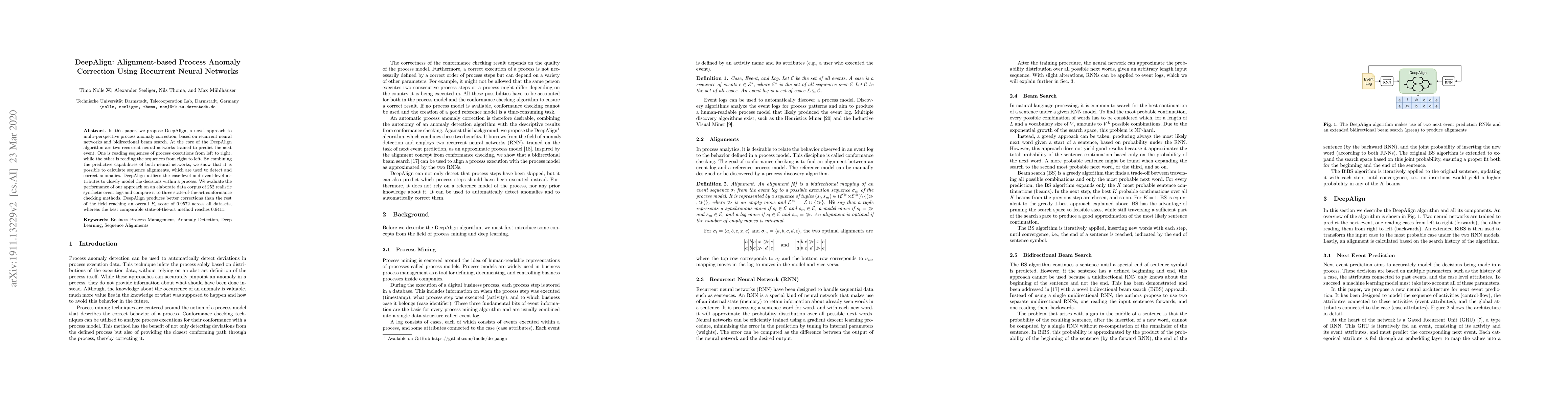 DeepAlign employs recurrent neural networks and bidirectional beam search for multi-perspective process anomaly correction, achieving superior anomaly detection and correction with an $F_1$ score of $0.9572$ compared to state-of-the-art methods.