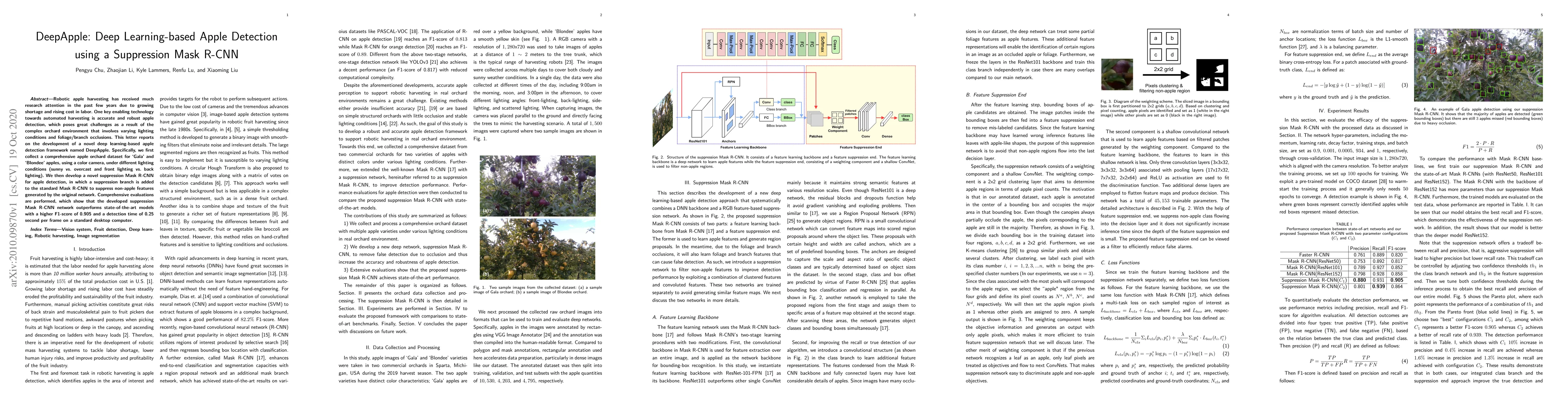 This paper introduces DeepApple, a deep learning framework using a suppression Mask R-CNN for accurate apple detection in complex orchard environments. The developed model, evaluated on a comprehensive dataset, outperforms existing methods with a high F1-score and fast detection speed.