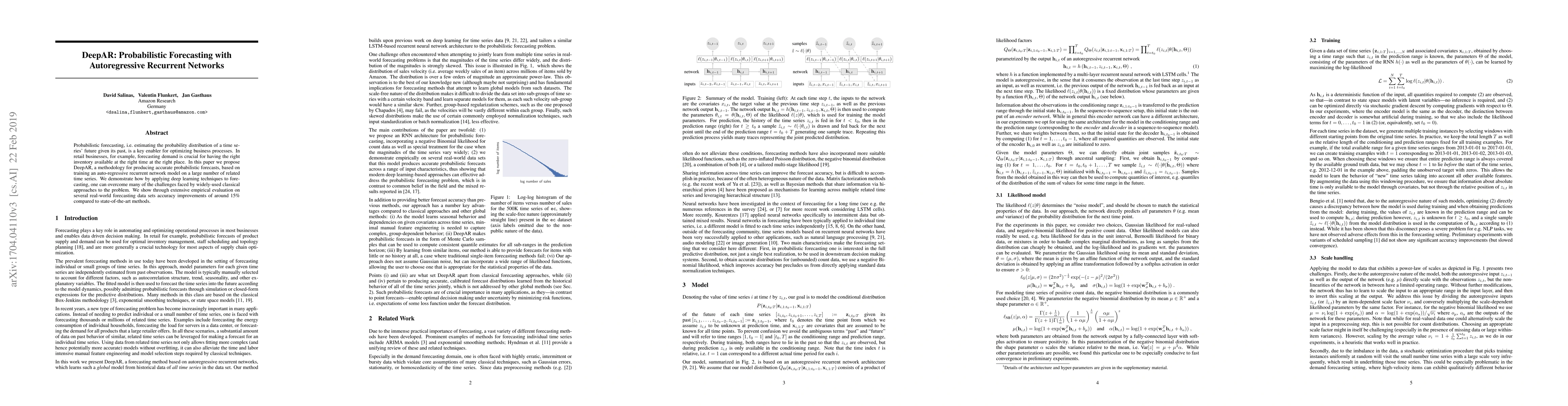 DeepAR employs an auto regressive recurrent network to generate probabilistic forecasts, significantly improving accuracy over traditional methods. Empirical evaluations show a 15% improvement in forecasting accuracy across various real-world datasets.