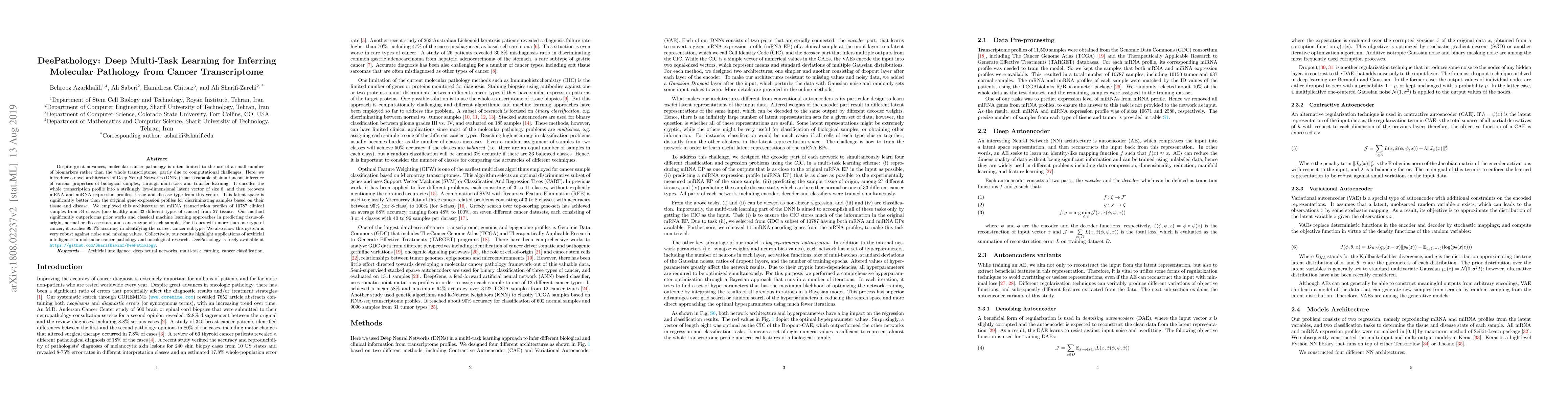 Despite great advances, molecular cancer pathology is often limited to the use of a small number of biomarkers rather than the whole transcriptome, partly due to computational challenges. Here, we introduce a novel architecture of Deep Neural Networks (DNNs) that is capable of simultaneous inference of various properties of biological samples, through multi-task and transfer learning. It encodes the whole transcription profile into a strikingly low-dimensional latent vector of size 8, and then recovers mRNA and miRNA expression profiles, tissue and disease type from this vector. This latent space is significantly better than the original gene expression profiles for discriminating samples based on their tissue and disease. We employed this architecture on mRNA transcription profiles of 10787 clinical samples from 34 classes (one healthy and 33 different types of cancer) from 27 tissues. Our method significantly outperforms prior works and classical machine learning approaches in predicting tissue-of-origin, normal or disease state and cancer type of each sample. For tissues with more than one type of cancer, it reaches 99.4\% accuracy in identifying the correct cancer subtype. We also show this system is very robust against noise and missing values. Collectively, our results highlight applications of artificial intelligence in molecular cancer pathology and oncological research. DeePathology is freely available at \url{https://github.com/SharifBioinf/DeePathology}.