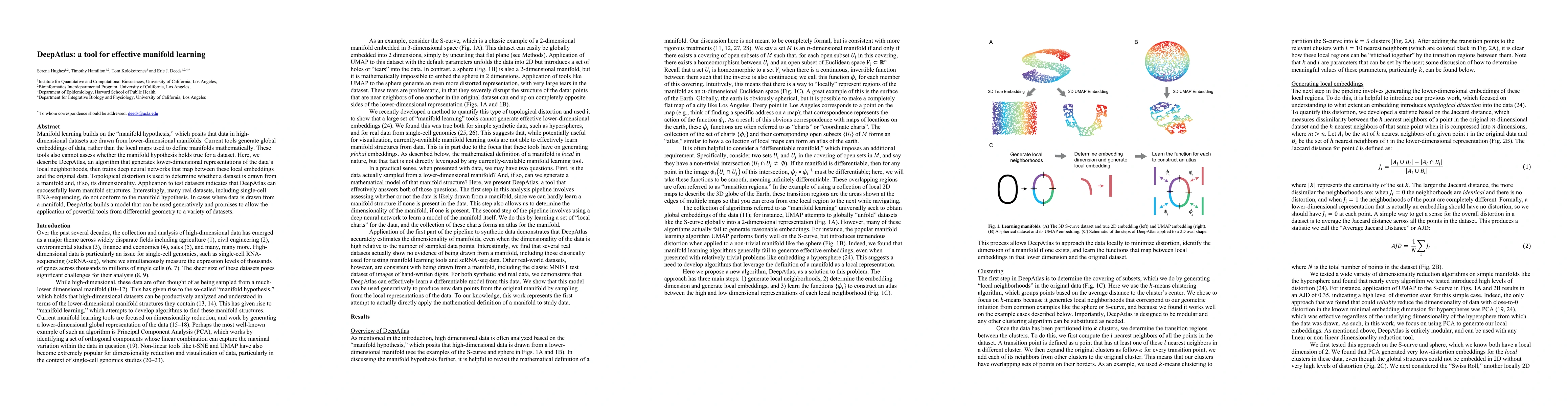 Manifold learning builds on the "manifold hypothesis," which posits that data in high-dimensional datasets are drawn from lower-dimensional manifolds. Current tools generate global embeddings of data, rather than the local maps used to define manifolds mathematically. These tools also cannot assess whether the manifold hypothesis holds true for a dataset. Here, we describe DeepAtlas, an algorithm that generates lower-dimensional representations of the data's local neighborhoods, then trains deep neural networks that map between these local embeddings and the original data. Topological distortion is used to determine whether a dataset is drawn from a manifold and, if so, its dimensionality. Application to test datasets indicates that DeepAtlas can successfully learn manifold structures. Interestingly, many real datasets, including single-cell RNA-sequencing, do not conform to the manifold hypothesis. In cases where data is drawn from a manifold, DeepAtlas builds a model that can be used generatively and promises to allow the application of powerful tools from differential geometry to a variety of datasets.