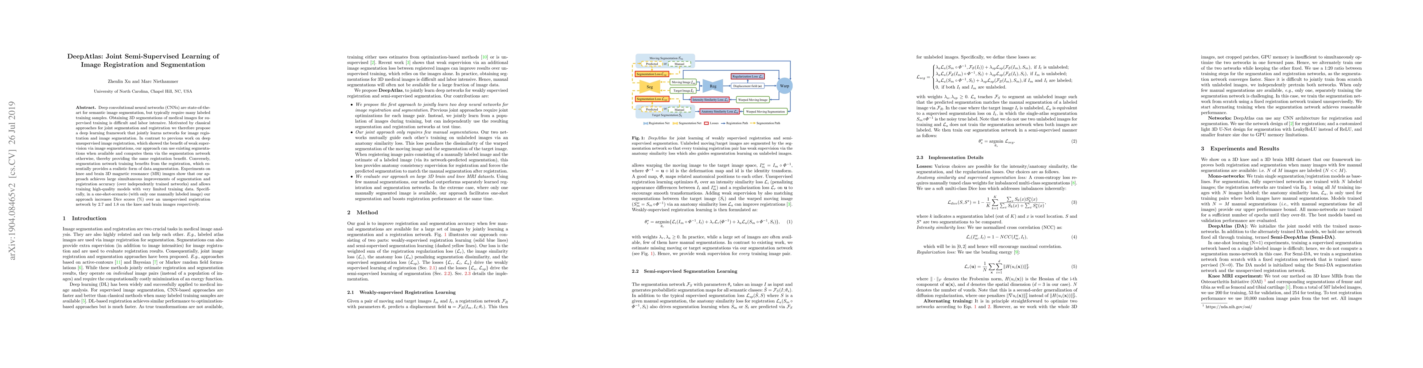 DeepAtlas proposes a joint semi-supervised learning framework for image registration and segmentation, leveraging existing segmentations or generating them via the segmentation network, to improve both tasks' accuracy with limited labeled data. Experiments demonstrate significant improvements in segmentation and registration accuracy, especially with minimal manual labeling.