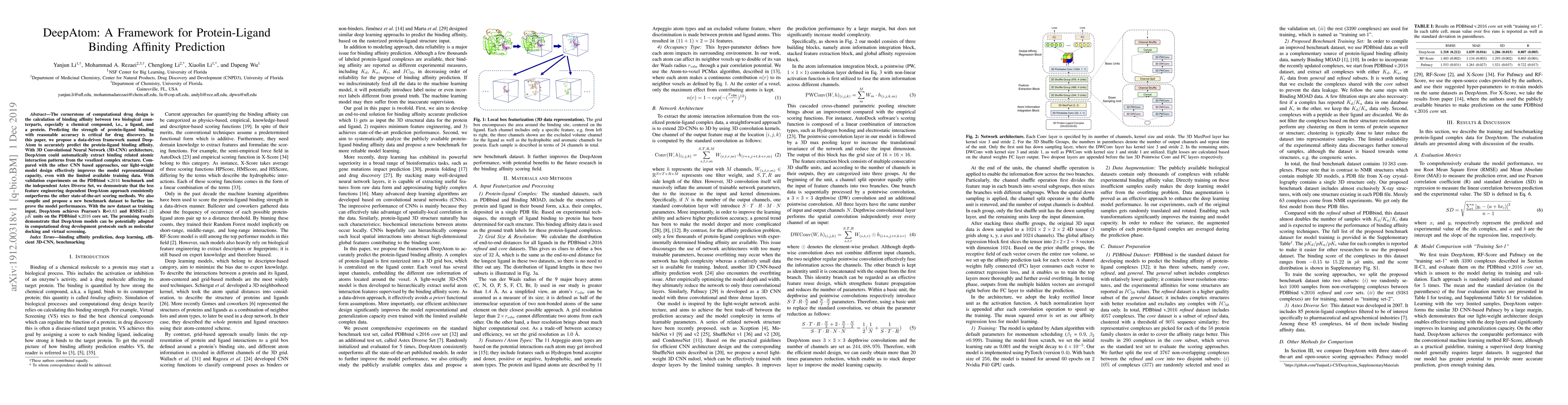 DeepAtom is a data-driven framework utilizing 3D Convolutional Neural Networks to predict protein-ligand binding affinity, outperforming other methods with less feature engineering dependency. It achieves a Pearson's R=0.83 and RMSE=1.23 on the PDBbind v.2016 benchmark, showing potential for drug discovery applications.