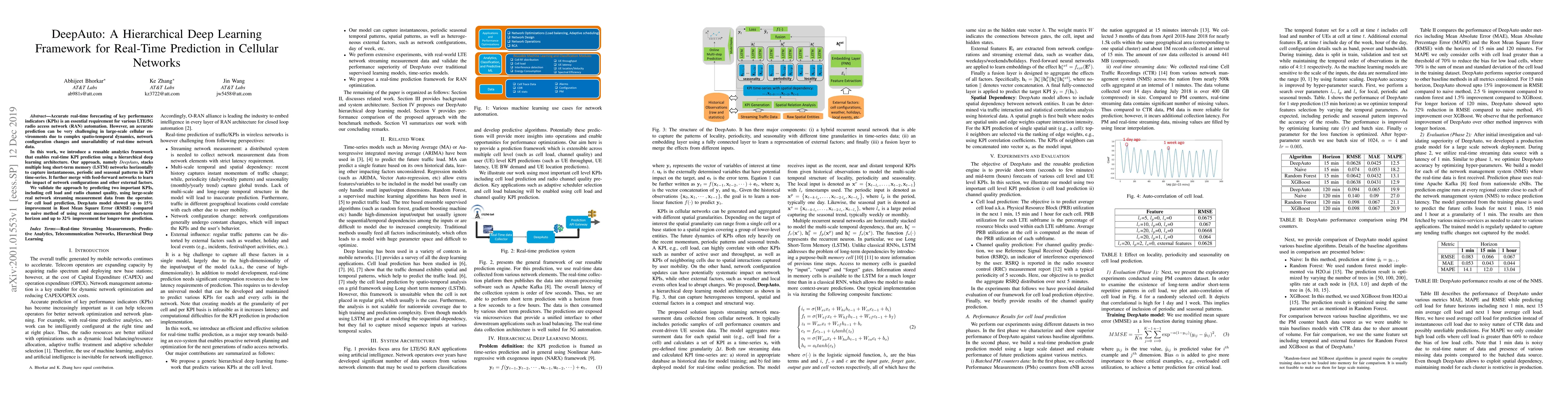 DeepAuto is a hierarchical deep learning framework that uses stacked LSTM networks and feed-forward networks to predict key performance indicators in LTE/5G networks in real-time. It shows significant improvements in predicting cell load and radio channel quality compared to traditional methods.