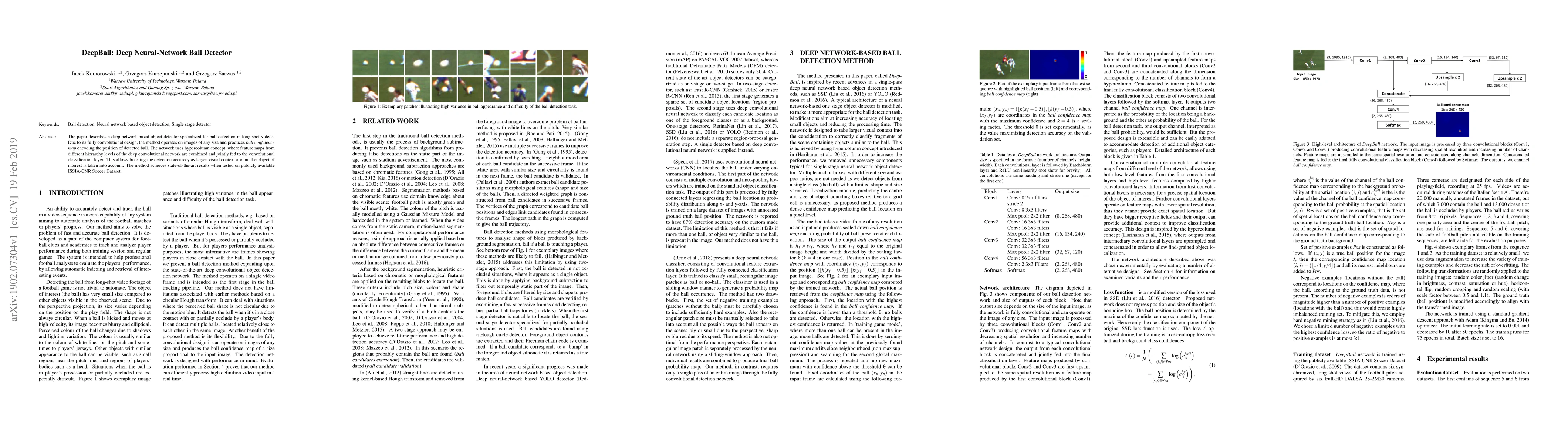 The paper introduces DeepBall, a deep neural network for detecting balls in long shot videos, leveraging a fully convolutional design and the hypercolumn concept to enhance detection accuracy by incorporating larger visual context. It achieves top performance on the ISSIA-CNR Soccer Dataset.