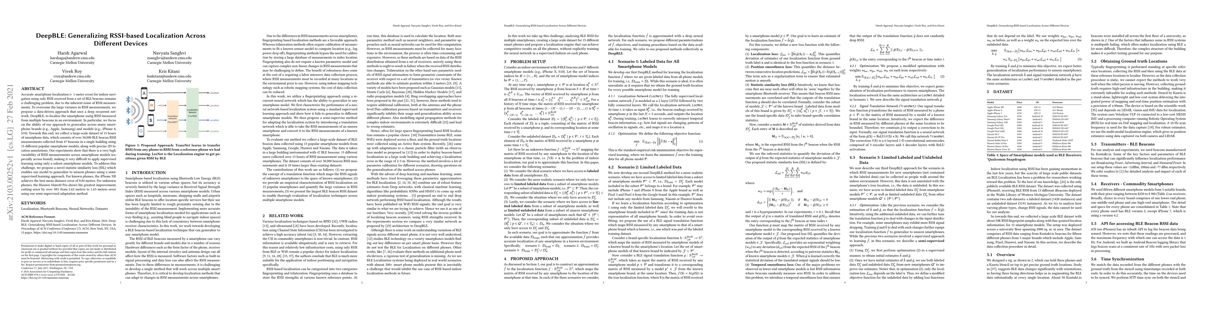 Accurate smartphone localization (< 1-meter error) for indoor navigation using only RSSI received from a set of BLE beacons remains a challenging problem, due to the inherent noise of RSSI measurements. To overcome the large variance in RSSI measurements, we propose a data-driven approach that uses a deep recurrent network, DeepBLE, to localize the smartphone using RSSI measured from multiple beacons in an environment. In particular, we focus on the ability of our approach to generalize across many smartphone brands (e.g., Apple, Samsung) and models (e.g., iPhone 8, S10). Towards this end, we collect a large-scale dataset of 15 hours of smartphone data, which consists of over 50,000 BLE beacon RSSI measurements collected from 47 beacons in a single building using 15 different popular smartphone models, along with precise 2D location annotations. Our experiments show that there is a very high variability of RSSI measurements across smartphone models (especially across brand), making it very difficult to apply supervised learning using only a subset of smartphone models. To address this challenge, we propose a novel statistic similarity loss (SSL) which enables our model to generalize to unseen phones using a semi-supervised learning approach. For known phones, the iPhone XR achieves the best mean distance error of 0.84 meters. For unknown phones, the Huawei Mate20 Pro shows the greatest improvement, cutting error by over 38\% from 2.62 meters to 1.63 meters error using our semi-supervised adaptation method.