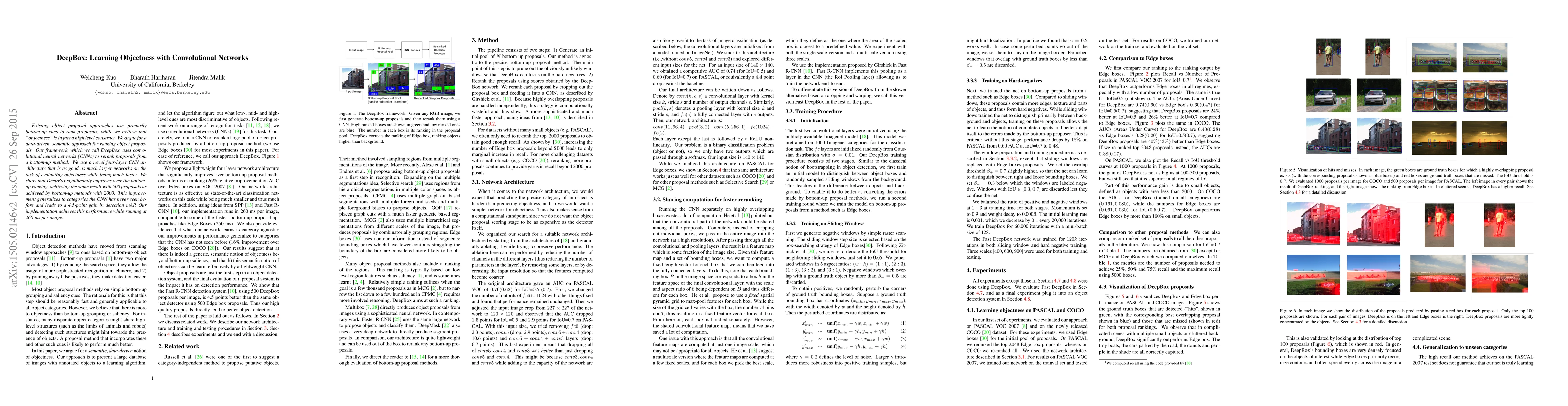 Existing object proposal approaches use primarily bottom-up cues to rank proposals, while we believe that objectness is in fact a high level construct. We argue for a data-driven, semantic approach for ranking object proposals. Our framework, which we call DeepBox, uses convolutional neural networks (CNNs) to rerank proposals from a bottom-up method. We use a novel four-layer CNN architecture that is as good as much larger networks on the task of evaluating objectness while being much faster. We show that DeepBox significantly improves over the bottom-up ranking, achieving the same recall with 500 proposals as achieved by bottom-up methods with 2000. This improvement generalizes to categories the CNN has never seen before and leads to a 4.5-point gain in detection mAP. Our implementation achieves this performance while running at 260 ms per image.