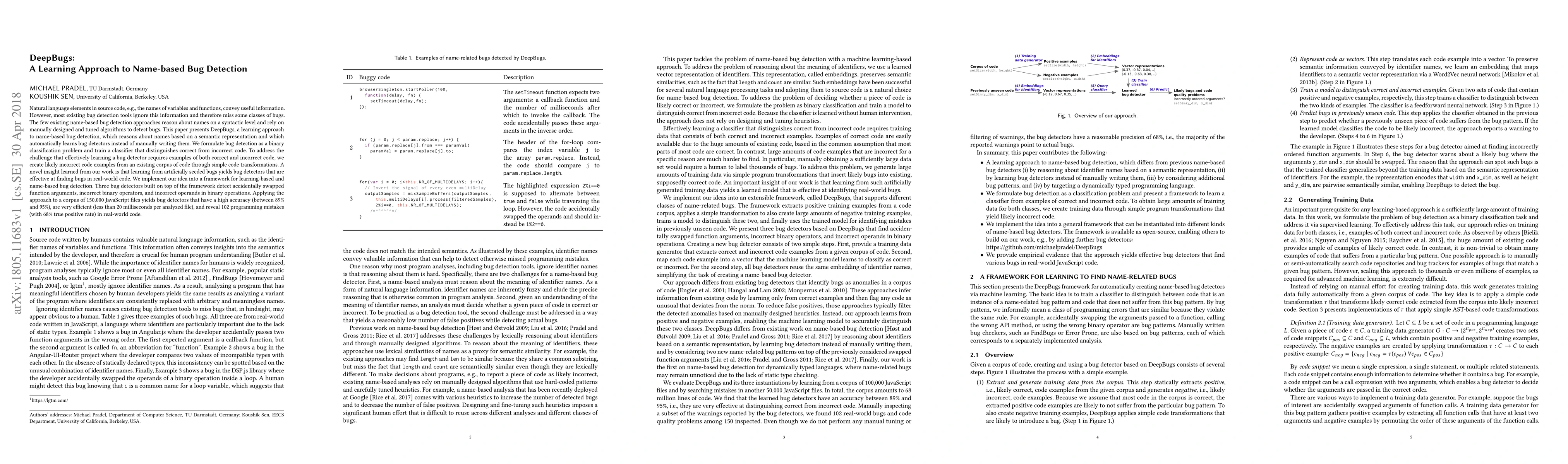 DeepBugs introduces a novel learning-based approach for detecting bugs using semantic representations of variable and function names, automatically learning bug detectors instead of relying on manual algorithms. This method effectively identifies bugs in real-world code by training on artificially generated incorrect examples, achieving high accuracy and efficiency.