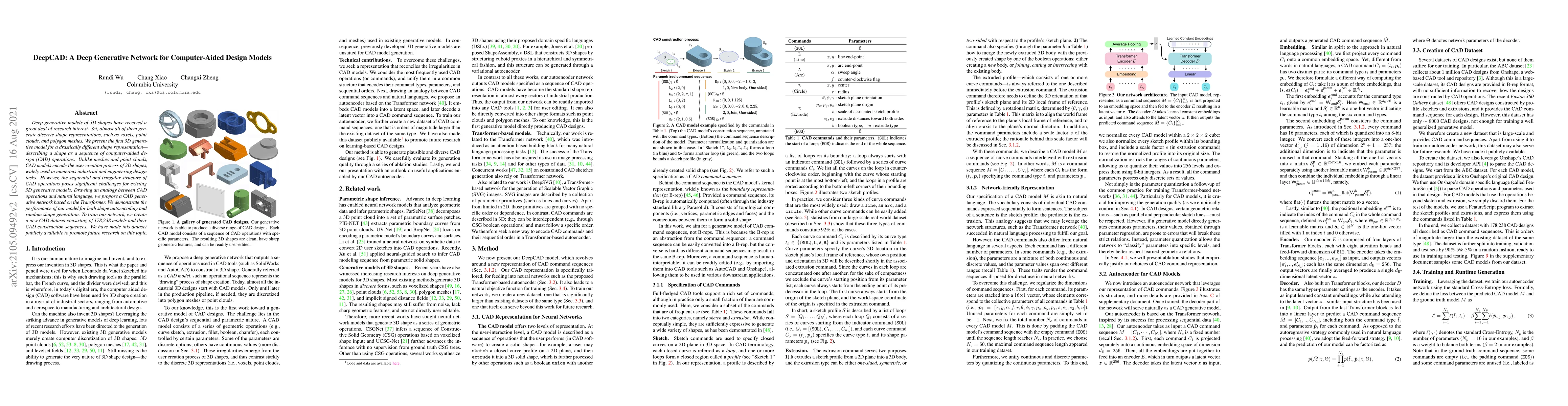 DeepCAD introduces a novel 3D generative model that describes 3D shapes using CAD operations instead of conventional discrete representations, employing a Transformer-based network. The authors train and evaluate their model on a newly created dataset of 178,238 CAD models, and make the dataset publicly available to foster further research.