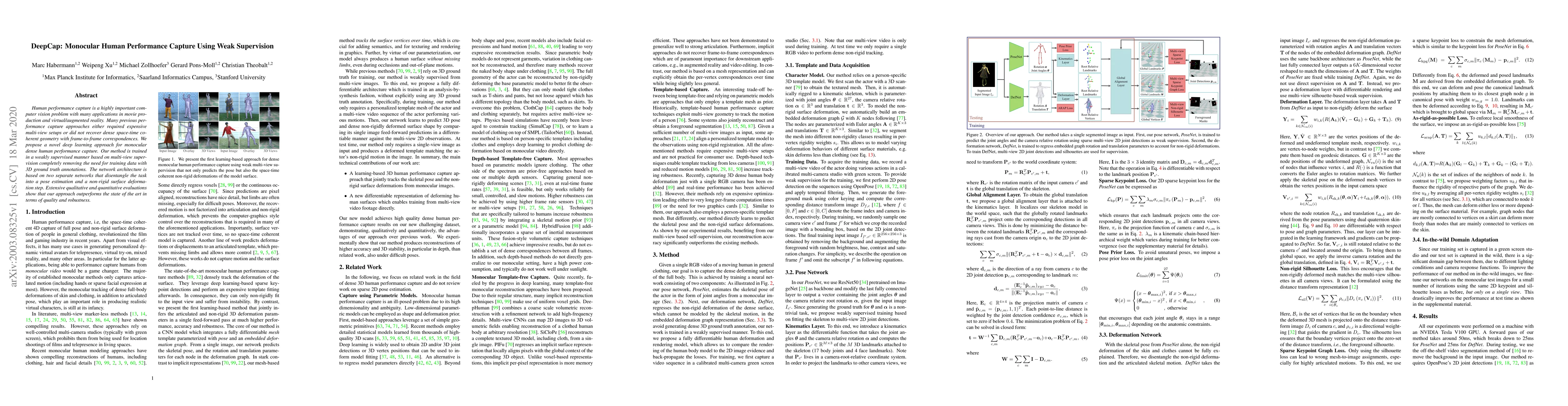 DeepCap is a monocular deep learning approach for dense human performance capture, trained with weak supervision using multi-view data instead of expensive 3D ground truth annotations. It separates pose estimation and non-rigid surface deformation, achieving superior quality and robustness compared to existing methods.