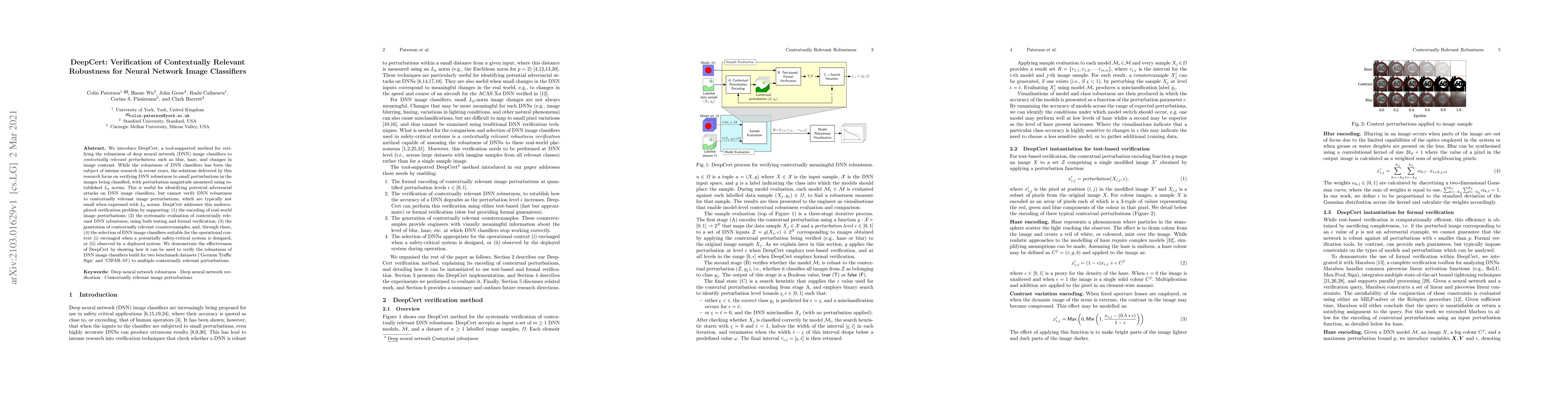 DeepCert is a method for verifying the robustness of neural network image classifiers to contextually relevant perturbations, such as blur and haze, which are typically larger than those addressed by existing methods. It supports encoding real-world perturbations, systematic evaluation, counterexample generation, and selection of robust classifiers for safety-critical systems.