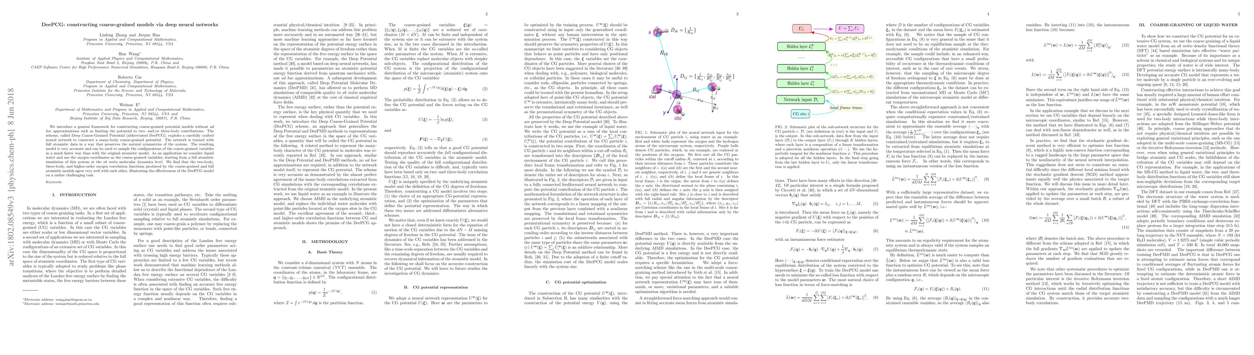 The DeePCG framework uses deep neural networks to construct accurate coarse-grained potential models without ad hoc approximations, enabling faster sampling of configurations compared to atomistic models. Applied to liquid water, it successfully reproduces correlation functions, demonstrating its effectiveness.