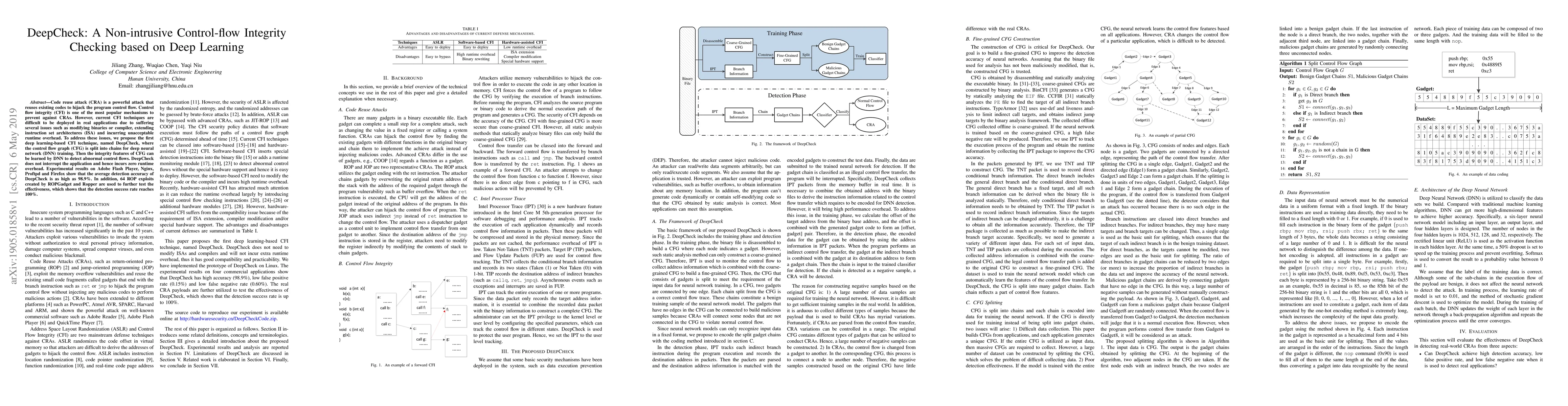 DeepCheck introduces a novel deep learning-based control flow integrity (CFI) technique to detect code reuse attacks without modifying binaries or incurring runtime overhead. The method achieves high detection accuracy of 98.9% on various applications and successfully detects all tested return-oriented programming (ROP) exploits.