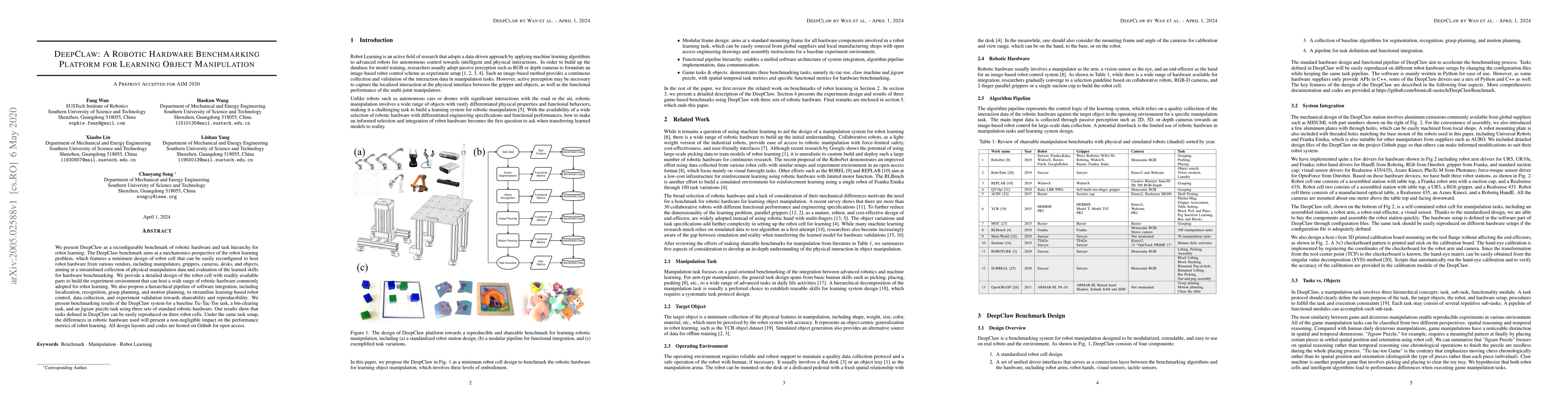 A new robotic hardware benchmarking platform called DeepClaw has been developed to streamline robot learning by providing a reconfigurable setup for various robotic hardware, enabling reproducible results across different hardware configurations.
