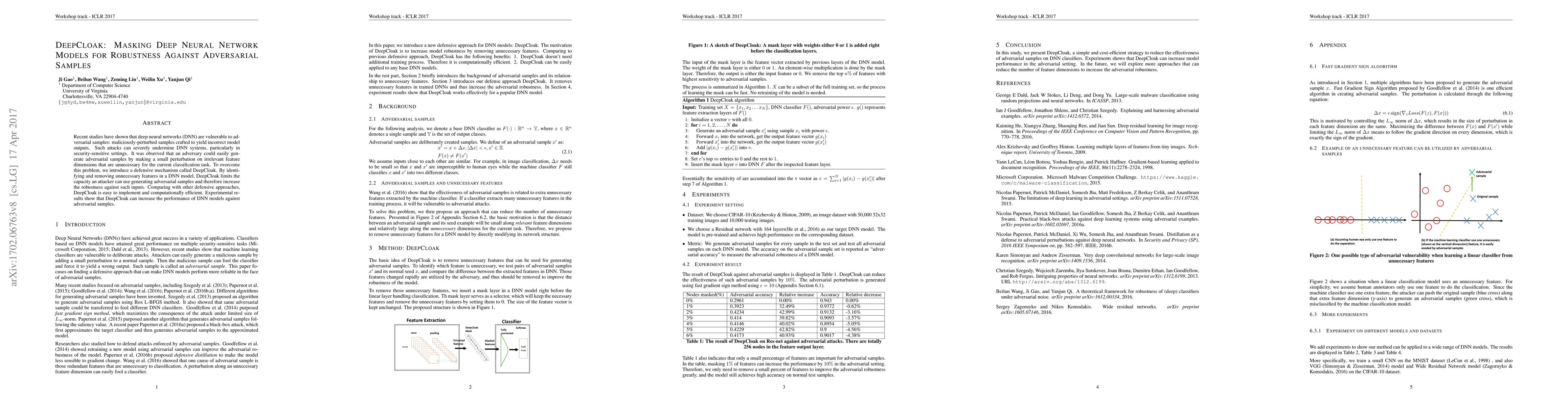 DeepCloak, a masking layer with weights either 0 or 1, is added right before the classification layers of DNN models, effectively removing unnecessary features and increasing robustness against adversarial samples.