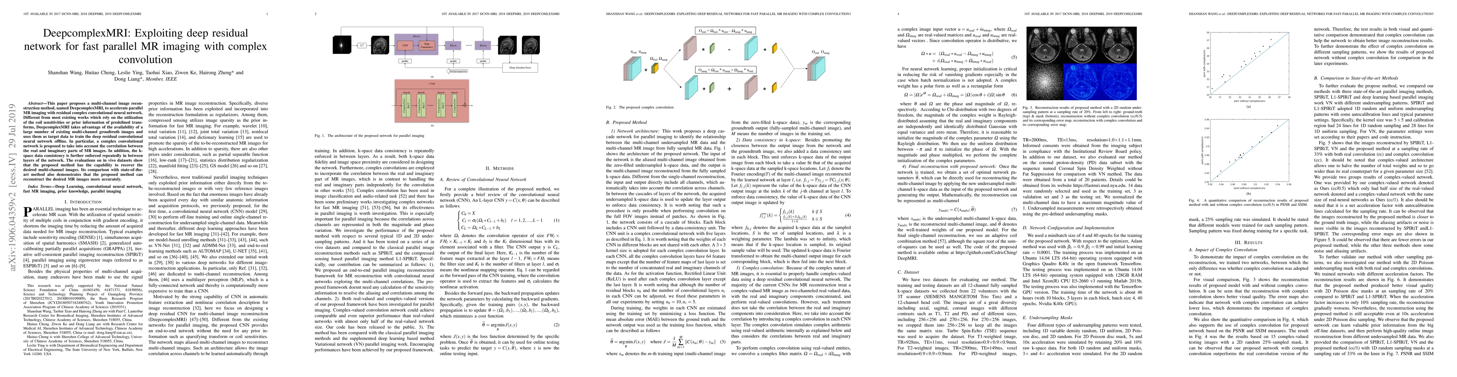 DeepcomplexMRI accelerates parallel MR imaging using a deep residual complex convolutional neural network trained on large groundtruth image datasets. It outperforms state-of-the-art methods in reconstructing accurate multi-channel images.