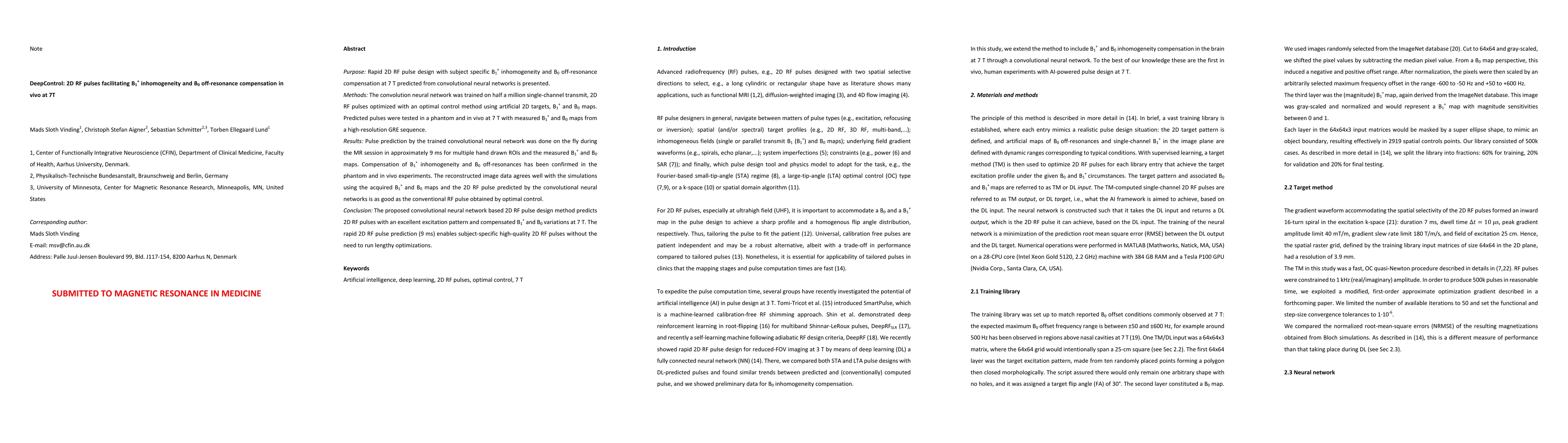 Purpose: Rapid 2D RF pulse design with subject specific $B_1^+$ inhomogeneity and $B_0$ off-resonance compensation at 7 T predicted from convolutional neural networks is presented. Methods: The convolution neural network was trained on half a million single-channel transmit, 2D RF pulses optimized with an optimal control method using artificial 2D targets, $B_1^+$ and $B_0$ maps. Predicted pulses were tested in a phantom and in vivo at 7 T with measured $B_1^+$ and $B_0$ maps from a high-resolution GRE sequence. Results: Pulse prediction by the trained convolutional neural network was done on the fly during the MR session in approximately 9 ms for multiple hand drawn ROIs and the measured $B_1^+$ and $B_0$ maps. Compensation of $B_1^+$ inhomogeneity and $B_0$ off-resonances has been confirmed in the phantom and in vivo experiments. The reconstructed image data agrees well with the simulations using the acquired $B_1^+$ and $B_0$ maps and the 2D RF pulse predicted by the convolutional neural networks is as good as the conventional RF pulse obtained by optimal control. Conclusion: The proposed convolutional neural network based 2D RF pulse design method predicts 2D RF pulses with an excellent excitation pattern and compensated $B_1^+$ and $B_0$ variations at 7 T. The rapid 2D RF pulse prediction (9 ms) enables subject-specific high-quality 2D RF pulses without the need to run lengthy optimizations.