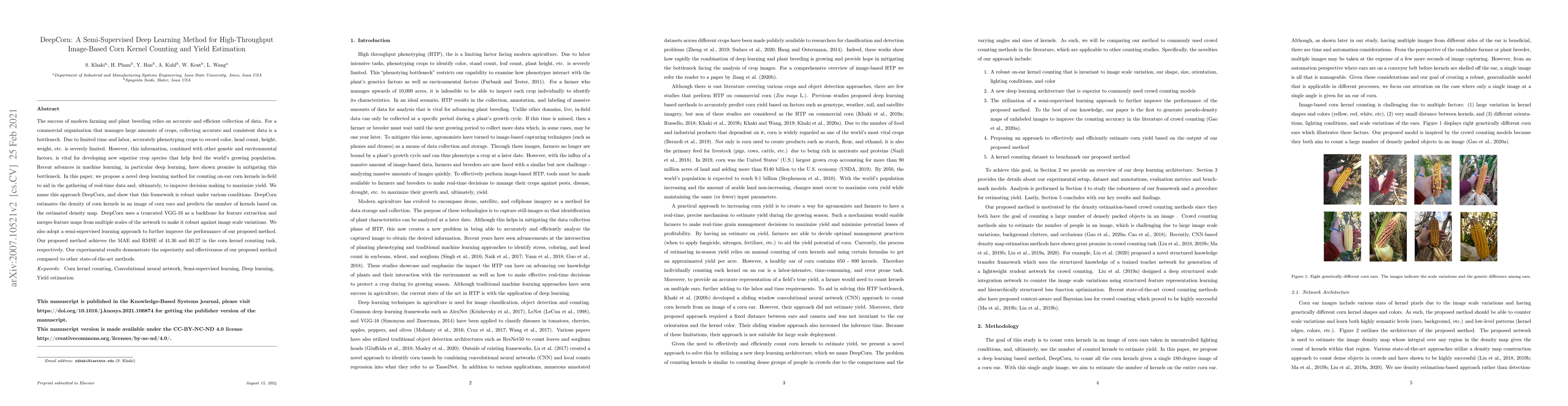 DeepCorn is a semi-supervised deep learning method designed for high-throughput image-based corn kernel counting and yield estimation, utilizing a truncated VGG-16 for feature extraction and multi-scale feature map merging. It achieves superior accuracy in kernel counting with an MAE of 41.36 and RMSE of 60.27, outperforming other state-of-the-art methods.