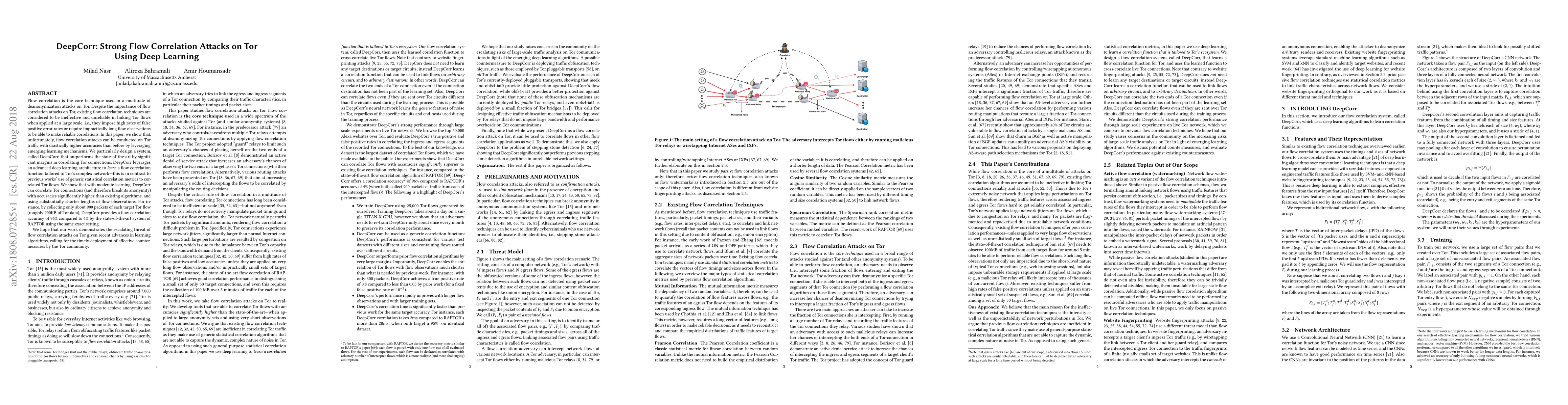 This paper introduces DeepCorr, a deep learning-based system that significantly improves the accuracy of flow correlation attacks on Tor, achieving 96% accuracy with only 900 packets per flow compared to 4% by the previous best method. This advancement highlights the growing threat to Tor's anonymity due to sophisticated machine learning techniques.