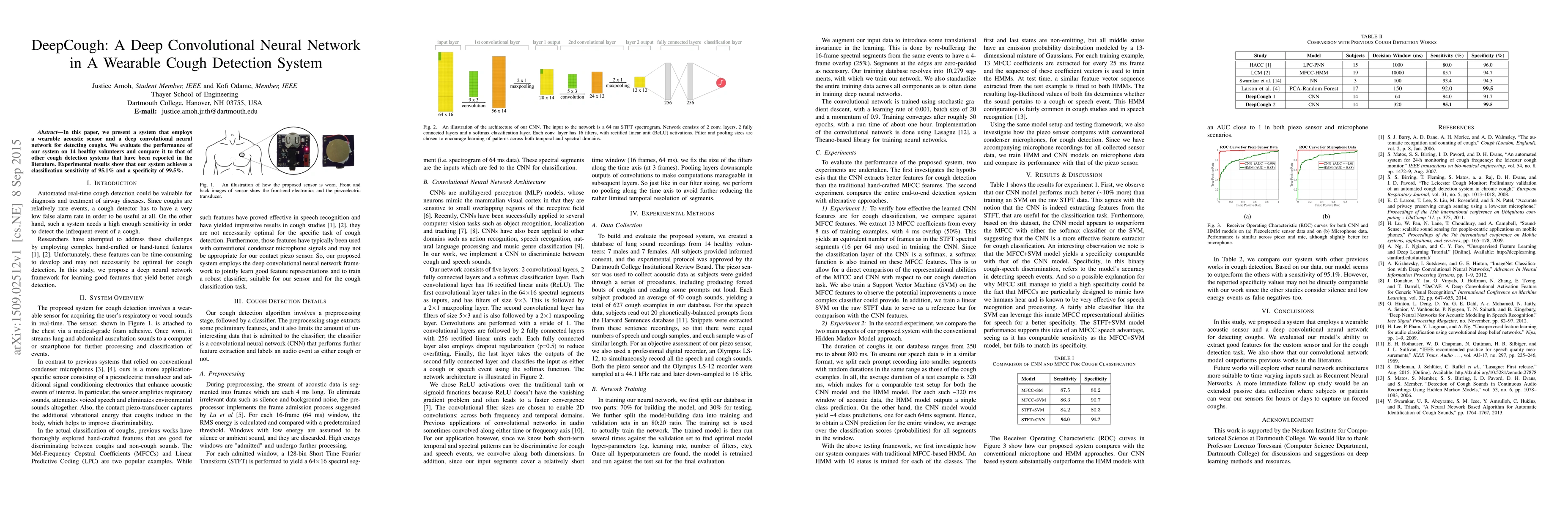 This paper introduces DeepCough, a wearable cough detection system utilizing a deep convolutional neural network and an acoustic sensor, achieving 95.1% sensitivity and 99.5% specificity in tests with 14 healthy volunteers. The system outperforms other reported cough detection methods.
