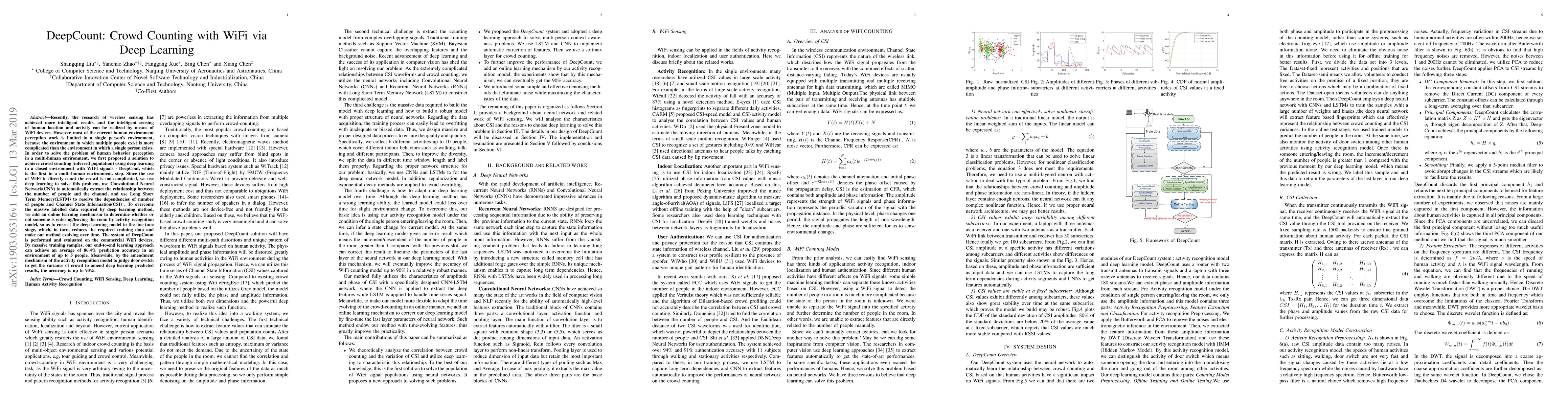 Recently, the research of wireless sensing has achieved more intelligent results, and the intelligent sensing of human location and activity can be realized by means of WiFi devices. However, most of the current human environment perception work is limited to a single person's environment, because the environment in which multiple people exist is more complicated than the environment in which a single person exists. In order to solve the problem of human behavior perception in a multi-human environment, we first proposed a solution to achieve crowd counting (inferred population) using deep learning in a closed environment with WIFI signals - DeepCout, which is the first in a multi-human environment. step. Since the use of WiFi to directly count the crowd is too complicated, we use deep learning to solve this problem, use Convolutional Neural Network(CNN) to automatically extract the relationship between the number of people and the channel, and use Long Short Term Memory(LSTM) to resolve the dependencies of number of people and Channel State Information(CSI) . To overcome the massive labelled data required by deep learning method, we add an online learning mechanism to determine whether or not someone is entering/leaving the room by activity recognition model, so as to correct the deep learning model in the fine-tune stage, which, in turn, reduces the required training data and make our method evolving over time. The system of DeepCount is performed and evaluated on the commercial WiFi devices. By massive training samples, our end-to-end learning approach can achieve an average of 86.4% prediction accuracy in an environment of up to 5 people. Meanwhile, by the amendment mechanism of the activity recognition model to judge door switch to get the variance of crowd to amend deep learning predicted results, the accuracy is up to 90%.
