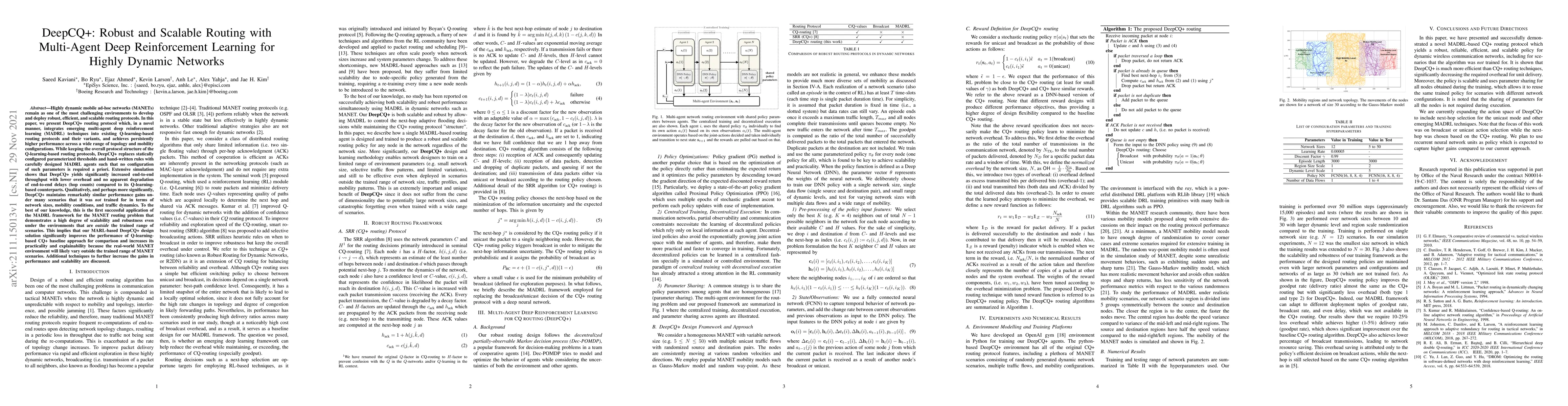DeepCQ+ integrates multi-agent deep reinforcement learning into Q-learning-based routing protocols for dynamic mobile ad-hoc networks, achieving higher performance and scalability without requiring pre-configured parameters. It demonstrates significant improvements in throughput and robustness across various network conditions.