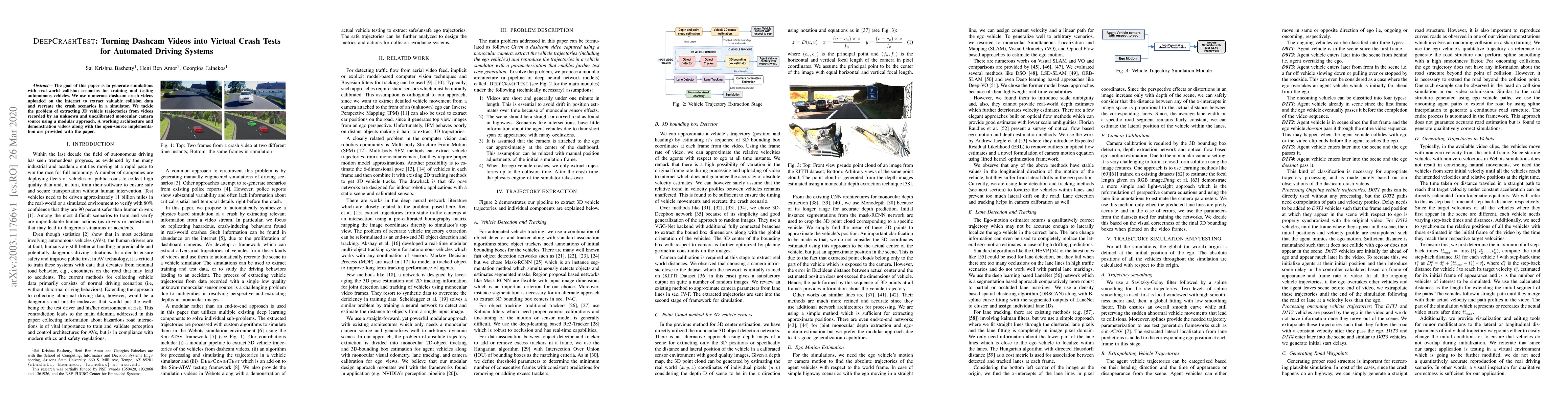 The goal of this paper is to generate simulations with real-world collision scenarios for training and testing autonomous vehicles. We use numerous dashcam crash videos uploaded on the internet to extract valuable collision data and recreate the crash scenarios in a simulator. We tackle the problem of extracting 3D vehicle trajectories from videos recorded by an unknown and uncalibrated monocular camera source using a modular approach. A working architecture and demonstration videos along with the open-source implementation are provided with the paper.