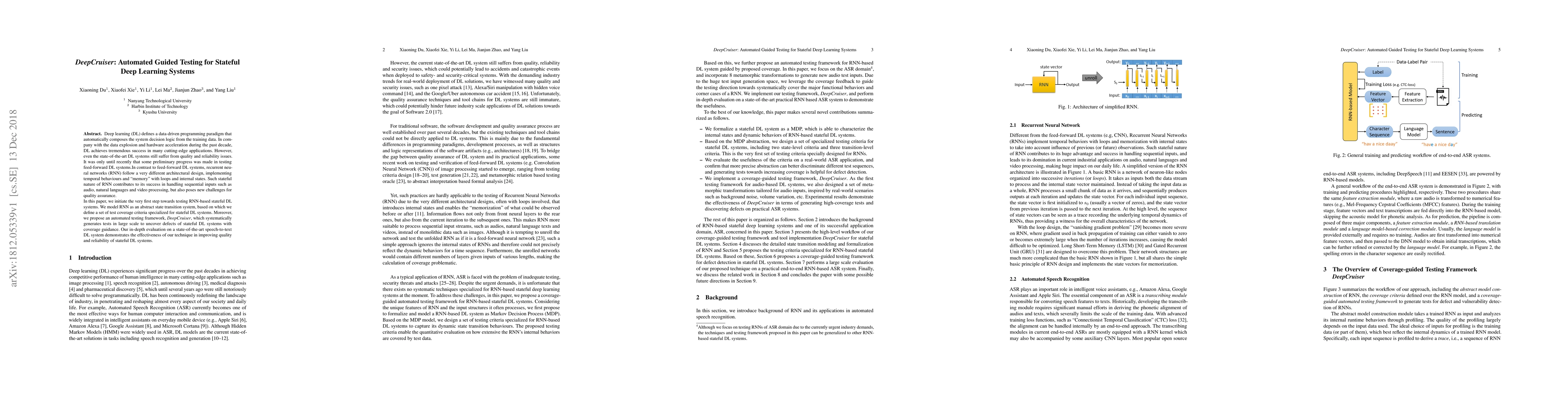 This paper introduces DeepCruiser, an automated testing framework for stateful deep learning systems, particularly recurrent neural networks (RNN). It proposes specialized test coverage criteria and systematically generates tests to uncover defects, demonstrating improved quality and reliability in a speech-to-text system.