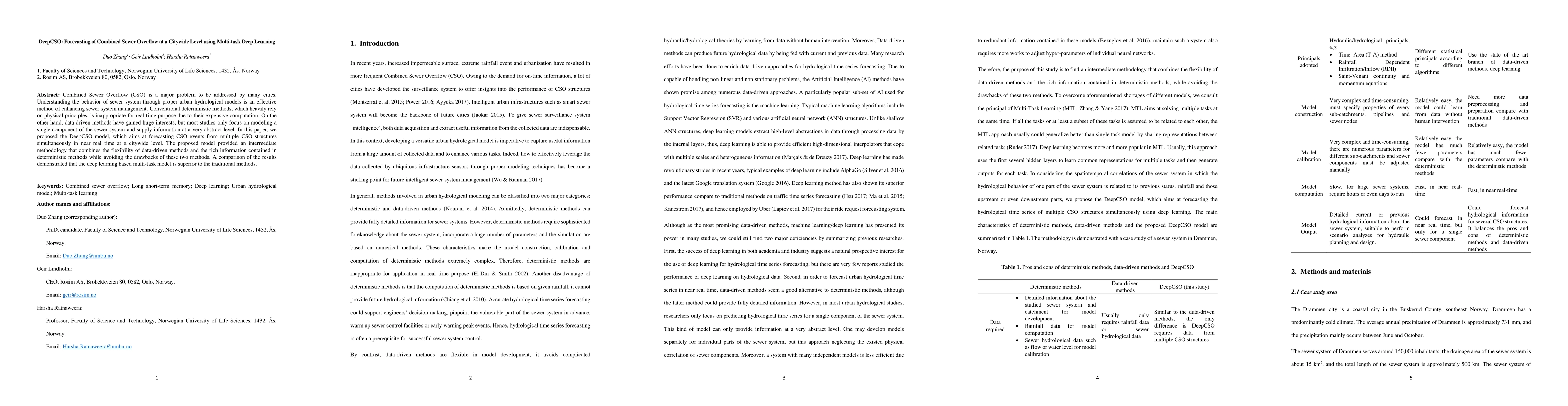 Combined Sewer Overflow (CSO) is a major problem to be addressed by many cities. Understanding the behavior of sewer system through proper urban hydrological models is an effective method of enhancing sewer system management. Conventional deterministic methods, which heavily rely on physical principles, is inappropriate for real-time purpose due to their expensive computation. On the other hand, data-driven methods have gained huge interests, but most studies only focus on modeling a single component of the sewer system and supply information at a very abstract level. In this paper, we proposed the DeepCSO model, which aims at forecasting CSO events from multiple CSO structures simultaneously in near real time at a citywide level. The proposed model provided an intermediate methodology that combines the flexibility of data-driven methods and the rich information contained in deterministic methods while avoiding the drawbacks of these two methods. A comparison of the results demonstrated that the deep learning based multi-task model is superior to the traditional methods.