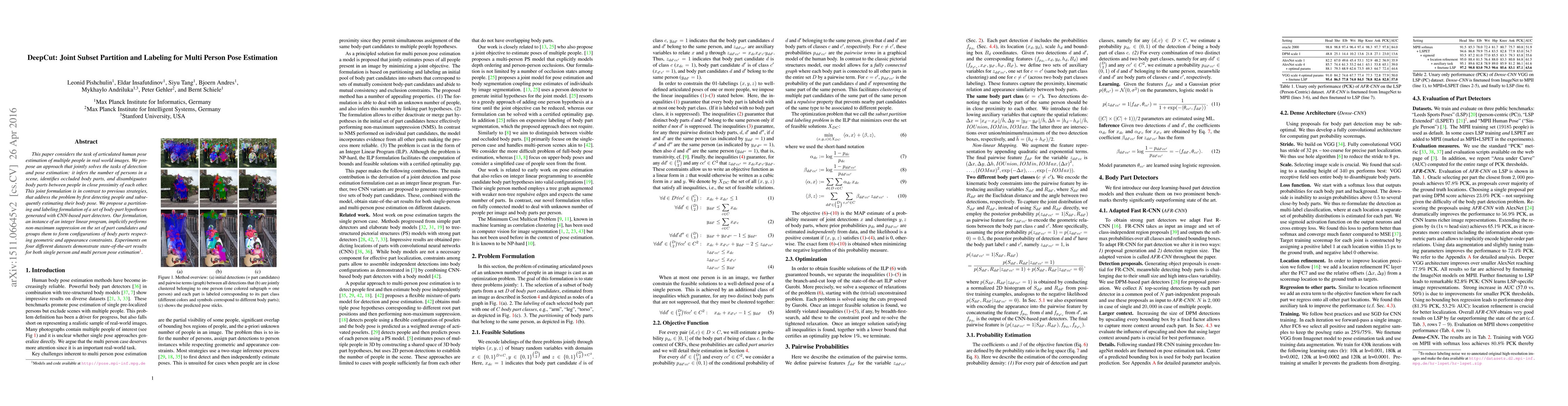 This paper proposes a joint approach for multi-person pose estimation that simultaneously detects and estimates poses, outperforming previous methods. It uses a partitioning and labeling formulation to manage occlusions and disambiguate body parts, achieving state-of-the-art results across multiple datasets.