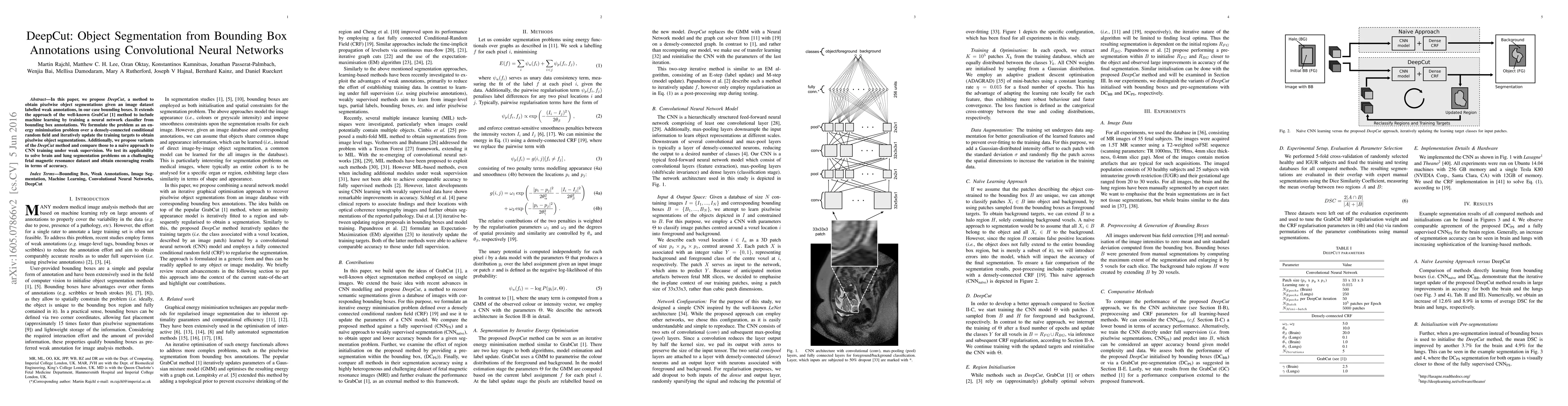 This paper introduces DeepCut, a novel method for obtaining pixelwise object segmentations using convolutional neural networks, extending the traditional GrabCut method with machine learning. The approach formulates the problem as an energy minimization problem and iteratively updates the training targets to achieve accurate segmentations, demonstrating effectiveness on brain and lung segmentation in a fetal magnetic resonance dataset. For more details, refer directly to the original research paper.