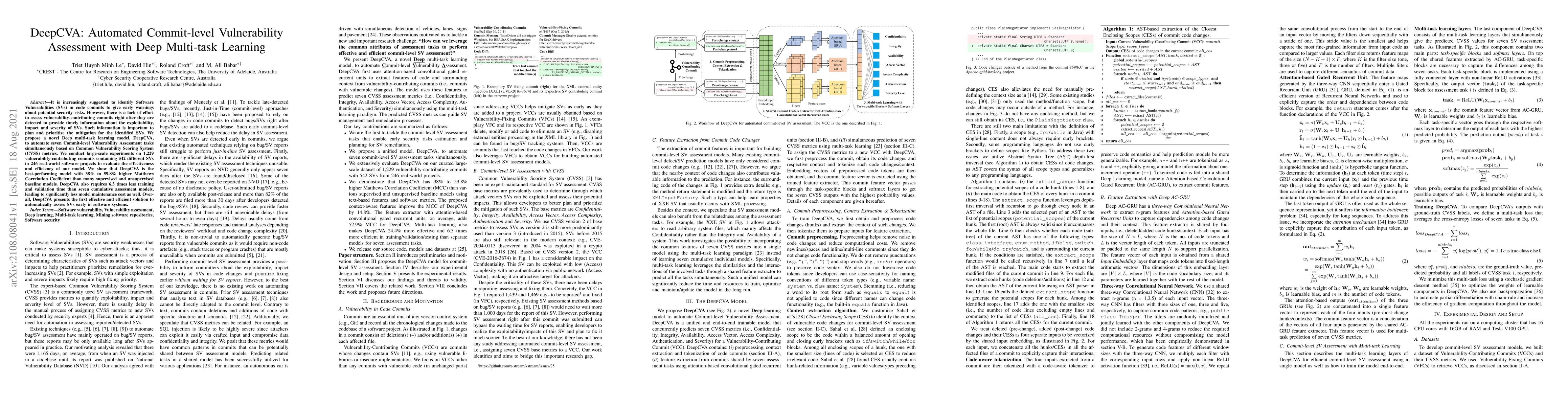 DeepCVA automates commit-level vulnerability assessment using deep multi-task learning, achieving superior performance in evaluating exploitability, impact, and severity of software vulnerabilities. The model outperforms existing methods, requiring significantly less time for training and validation.