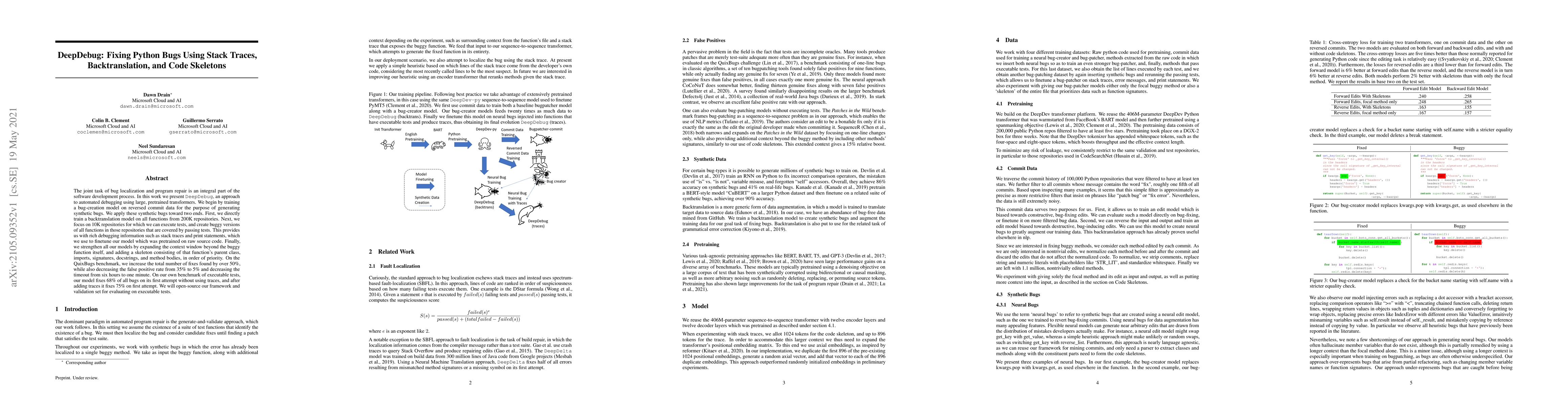 DeepDebug automates Python bug localization and repair using large transformers, synthetic bugs, and backtranslation, achieving a 50% increase in fixes on the QuixBugs benchmark and reducing false positives and timeouts significantly. The approach also fixes 68% of bugs on first attempt on a custom test set, rising to 75% with added stack traces.