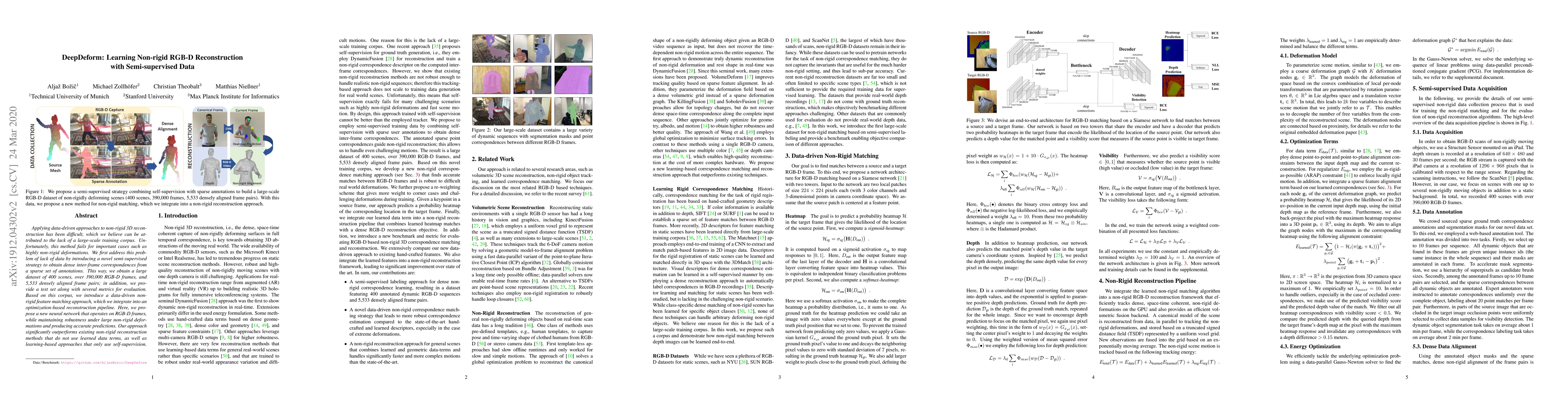 DeepDeform introduces a semi-supervised strategy to generate a large dataset for non-rigid 3D reconstruction, addressing the lack of training data. The method combines a new neural network with an optimization-based pipeline to achieve robust and accurate reconstructions under large non-rigid deformations, outperforming existing methods.