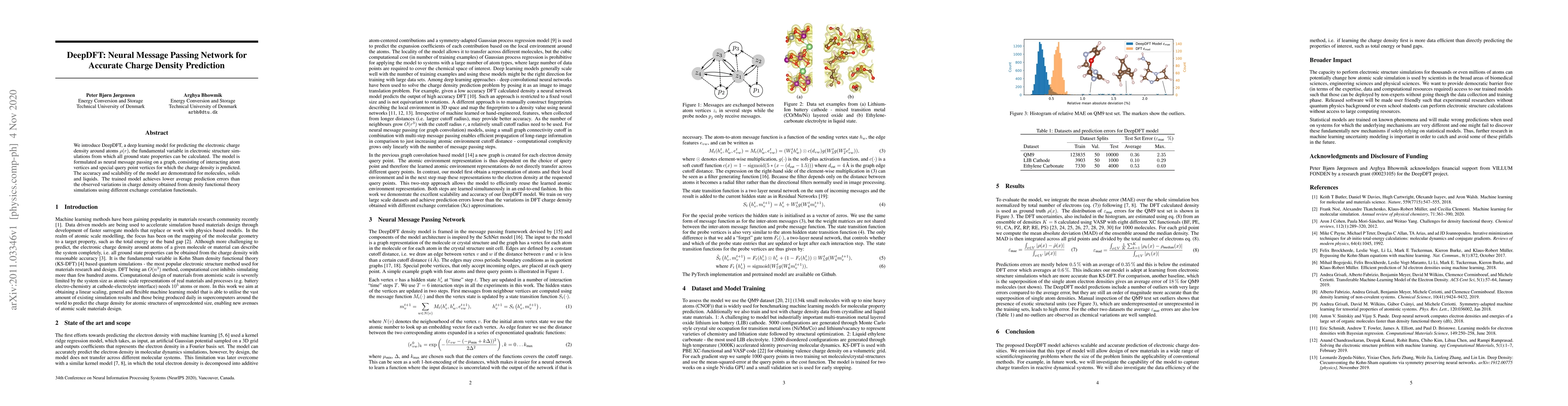 DeepDFT employs a neural message passing network to accurately predict electronic charge density, crucial for electronic structure simulations. The model demonstrates superior accuracy and scalability across molecules, solids, and liquids, outperforming variations in charge density from density functional theory simulations.