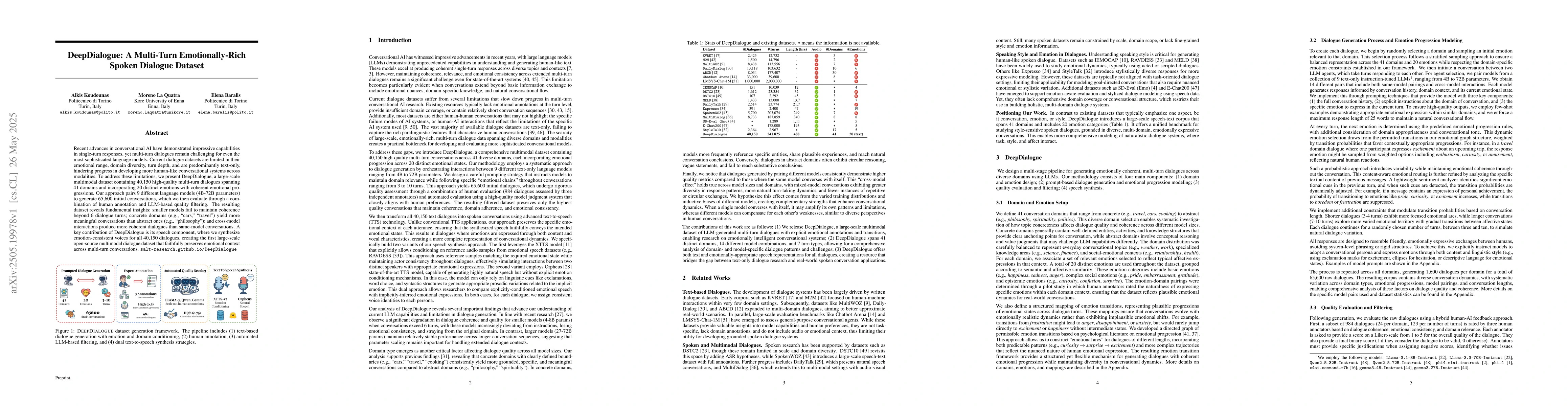 Recent advances in conversational AI have demonstrated impressive capabilities in single-turn responses, yet multi-turn dialogues remain challenging for even the most sophisticated language models. Current dialogue datasets are limited in their emotional range, domain diversity, turn depth, and are predominantly text-only, hindering progress in developing more human-like conversational systems across modalities. To address these limitations, we present DeepDialogue, a large-scale multimodal dataset containing 40,150 high-quality multi-turn dialogues spanning 41 domains and incorporating 20 distinct emotions with coherent emotional progressions. Our approach pairs 9 different language models (4B-72B parameters) to generate 65,600 initial conversations, which we then evaluate through a combination of human annotation and LLM-based quality filtering. The resulting dataset reveals fundamental insights: smaller models fail to maintain coherence beyond 6 dialogue turns; concrete domains (e.g., "cars," "travel") yield more meaningful conversations than abstract ones (e.g., "philosophy"); and cross-model interactions produce more coherent dialogues than same-model conversations. A key contribution of DeepDialogue is its speech component, where we synthesize emotion-consistent voices for all 40,150 dialogues, creating the first large-scale open-source multimodal dialogue dataset that faithfully preserves emotional context across multi-turn conversations.