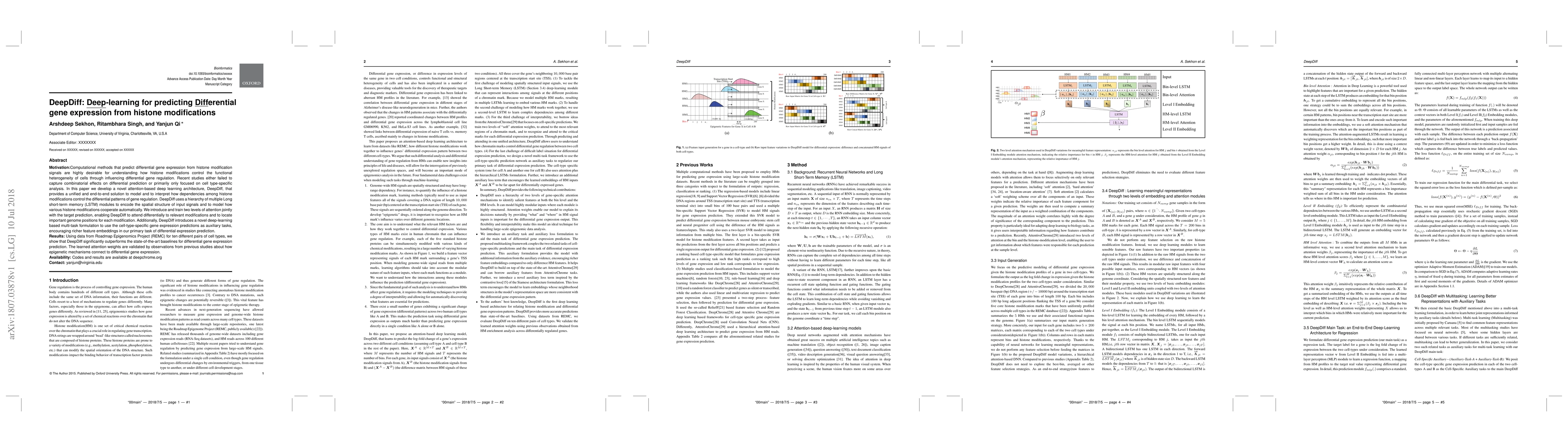 DeepDiff is a novel attention-based deep learning model that predicts differential gene expression from histone modifications, capturing combinatorial effects and improving over cell type-specific analyses. It employs hierarchical LSTM modules and multi-task learning to outperform existing methods, validated by biological observations.