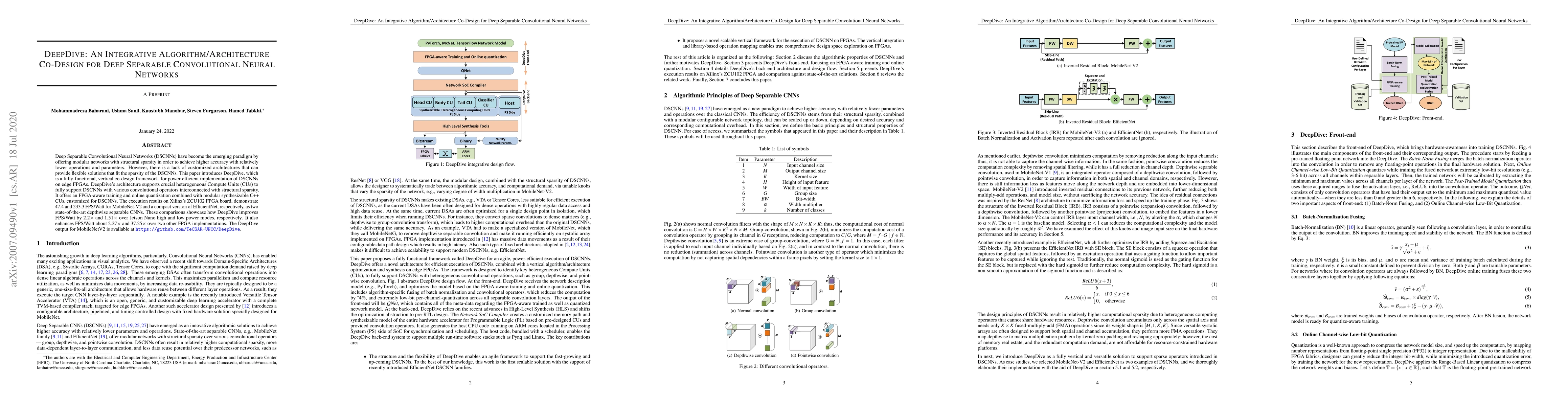 Deep Separable Convolutional Neural Networks (DSCNNs) have become the emerging paradigm by offering modular networks with structural sparsity in order to achieve higher accuracy with relatively lower operations and parameters. However, there is a lack of customized architectures that can provide flexible solutions that fit the sparsity of the DSCNNs. This paper introduces DeepDive, which is a fully-functional, vertical co-design framework, for power-efficient implementation of DSCNNs on edge FPGAs. DeepDive's architecture supports crucial heterogeneous Compute Units (CUs) to fully support DSCNNs with various convolutional operators interconnected with structural sparsity. It offers an FPGA-aware training and online quantization combined with modular synthesizable C++ CUs, customized for DSCNNs. The execution results on Xilinx's ZCU102 FPGA board, demonstrate 47.4 and 233.3 FPS/Watt for MobileNet-V2 and a compact version of EfficientNet, respectively, as two state-of-the-art depthwise separable CNNs. These comparisons showcase how DeepDive improves FPS/Watt by 2.2$\times$ and 1.51$\times$ over Jetson Nano high and low power modes, respectively. It also enhances FPS/Watt about 2.27$\times$ and 37.25$\times$ over two other FPGA implementations. The DeepDive output for MobileNetV2 is available at https://github.com/TeCSAR-UNCC/DeepDive.