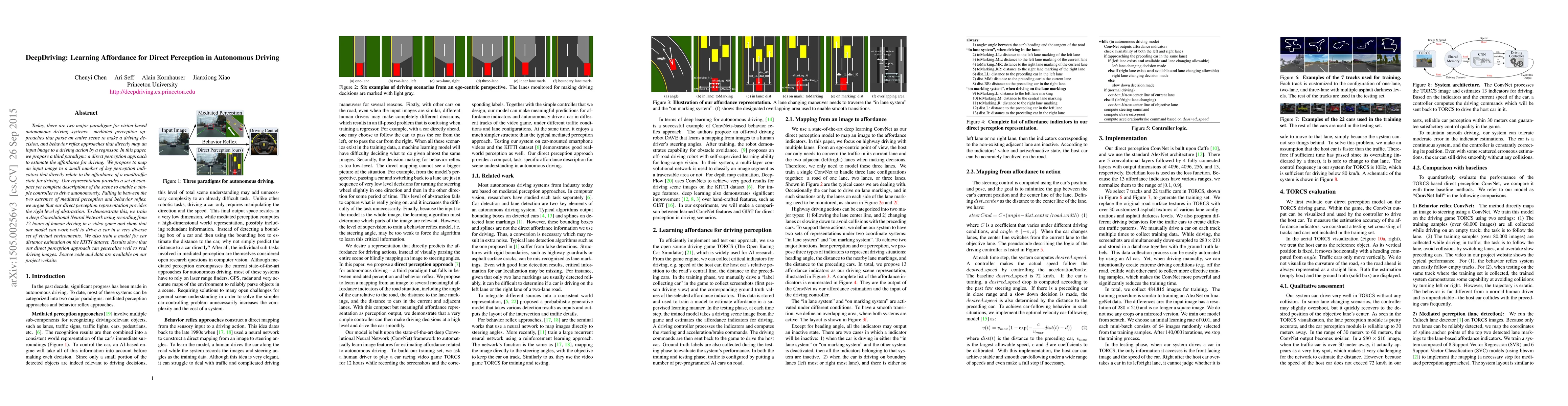 Today, there are two major paradigms for vision-based autonomous driving systems: mediated perception approaches that parse an entire scene to make a driving decision, and behavior reflex approaches that directly map an input image to a driving action by a regressor. In this paper, we propose a third paradigm: a direct perception approach to estimate the affordance for driving. We propose to map an input image to a small number of key perception indicators that directly relate to the affordance of a road/traffic state for driving. Our representation provides a set of compact yet complete descriptions of the scene to enable a simple controller to drive autonomously. Falling in between the two extremes of mediated perception and behavior reflex, we argue that our direct perception representation provides the right level of abstraction. To demonstrate this, we train a deep Convolutional Neural Network using recording from 12 hours of human driving in a video game and show that our model can work well to drive a car in a very diverse set of virtual environments. We also train a model for car distance estimation on the KITTI dataset. Results show that our direct perception approach can generalize well to real driving images. Source code and data are available on our project website.