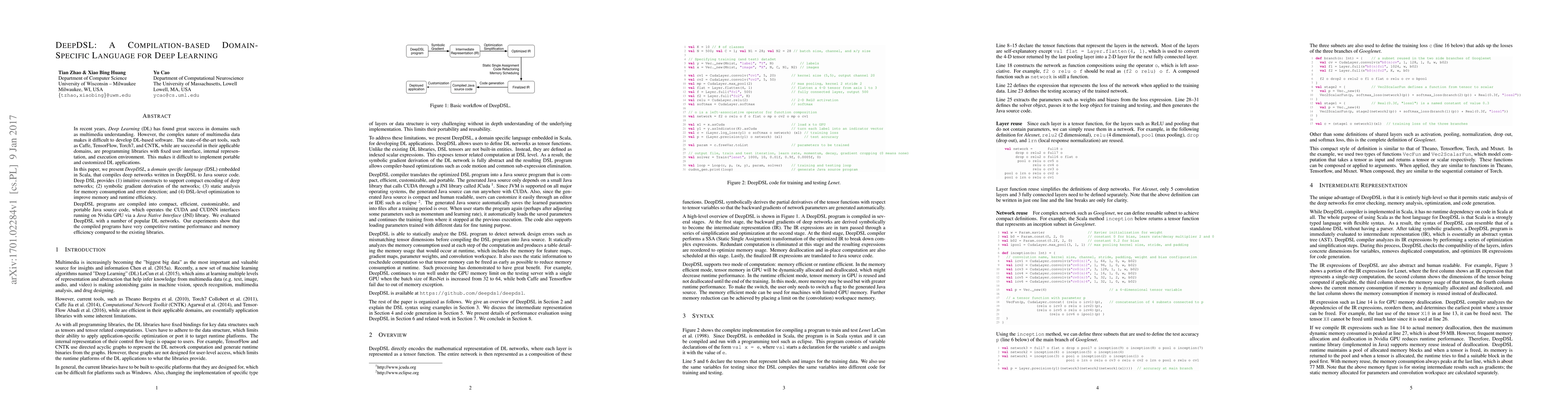 In recent years, Deep Learning (DL) has found great success in domains such as multimedia understanding. However, the complex nature of multimedia data makes it difficult to develop DL-based software. The state-of-the art tools, such as Caffe, TensorFlow, Torch7, and CNTK, while are successful in their applicable domains, are programming libraries with fixed user interface, internal representation, and execution environment. This makes it difficult to implement portable and customized DL applications. In this paper, we present DeepDSL, a domain specific language (DSL) embedded in Scala, that compiles deep networks written in DeepDSL to Java source code. Deep DSL provides (1) intuitive constructs to support compact encoding of deep networks; (2) symbolic gradient derivation of the networks; (3) static analysis for memory consumption and error detection; and (4) DSL-level optimization to improve memory and runtime efficiency. DeepDSL programs are compiled into compact, efficient, customizable, and portable Java source code, which operates the CUDA and CUDNN interfaces running on Nvidia GPU via a Java Native Interface (JNI) library. We evaluated DeepDSL with a number of popular DL networks. Our experiments show that the compiled programs have very competitive runtime performance and memory efficiency compared to the existing libraries.