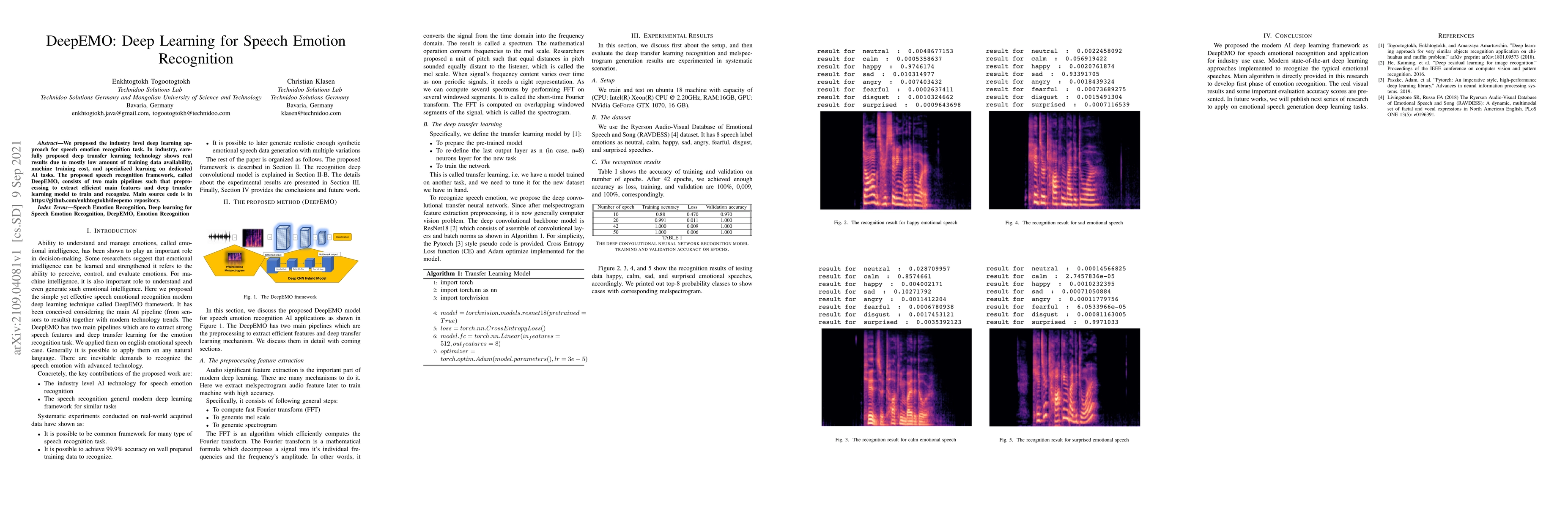 We proposed the industry level deep learning approach for speech emotion recognition task. In industry, carefully proposed deep transfer learning technology shows real results due to mostly low amount of training data availability, machine training cost, and specialized learning on dedicated AI tasks. The proposed speech recognition framework, called DeepEMO, consists of two main pipelines such that preprocessing to extract efficient main features and deep transfer learning model to train and recognize. Main source code is in https://github.com/enkhtogtokh/deepemo repository
