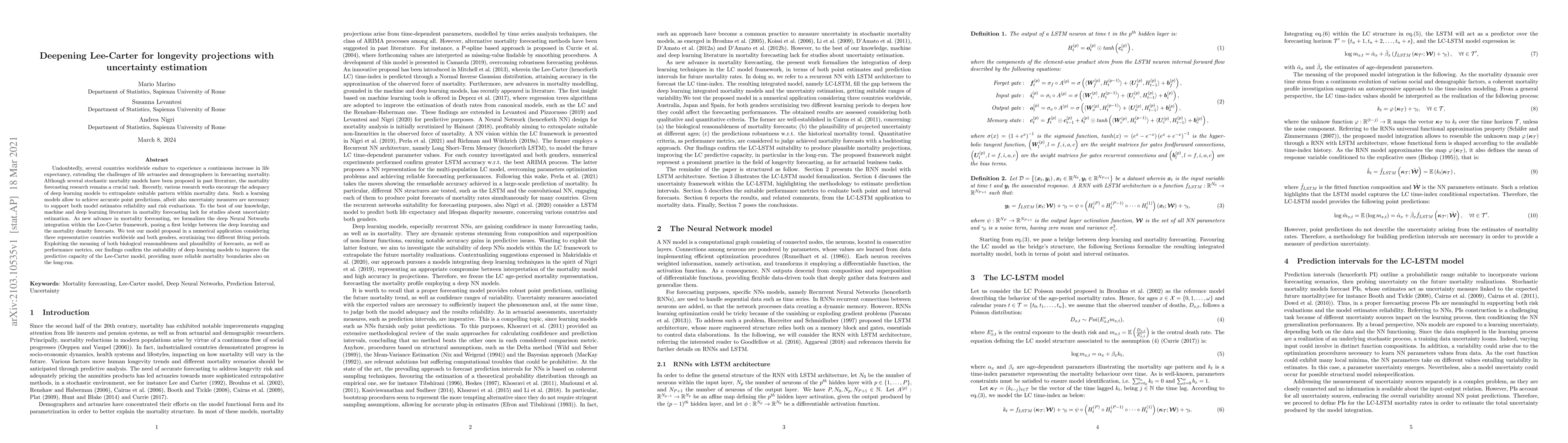 This paper proposes integrating deep Neural Networks within the Lee-Carter framework to enhance longevity projections and incorporate uncertainty estimation. The model is tested on three countries, showing improved predictive capacity and more reliable long-term mortality forecasts.