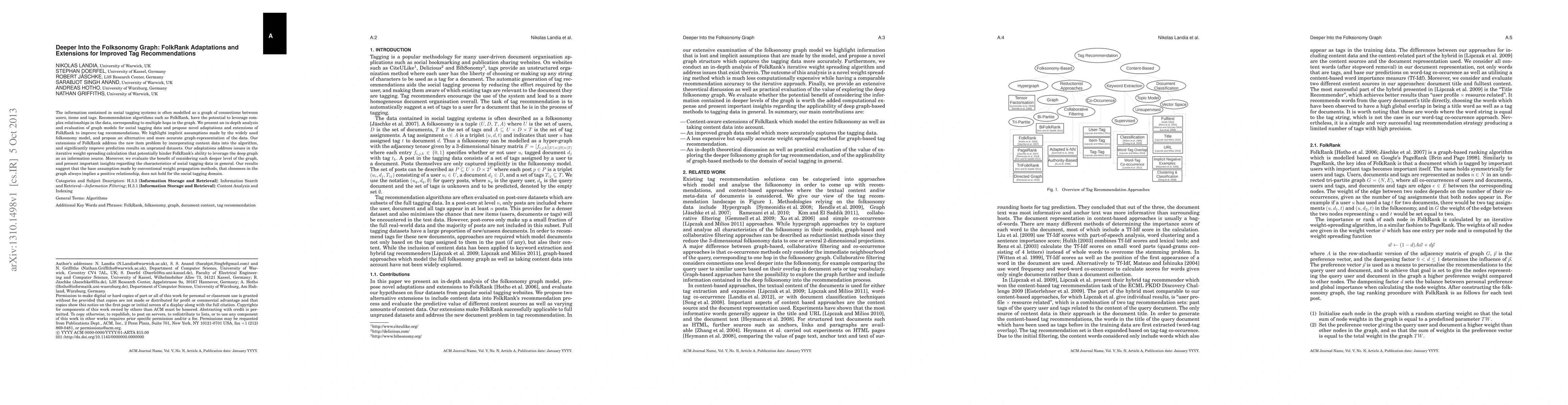 This paper proposes novel adaptations and extensions of the FolkRank algorithm to improve tag recommendations in social tagging systems by leveraging complex graph relationships. The authors introduce a more accurate graph representation and address the "new item problem" by incorporating content data, significantly enhancing prediction accuracy on unpruned datasets.