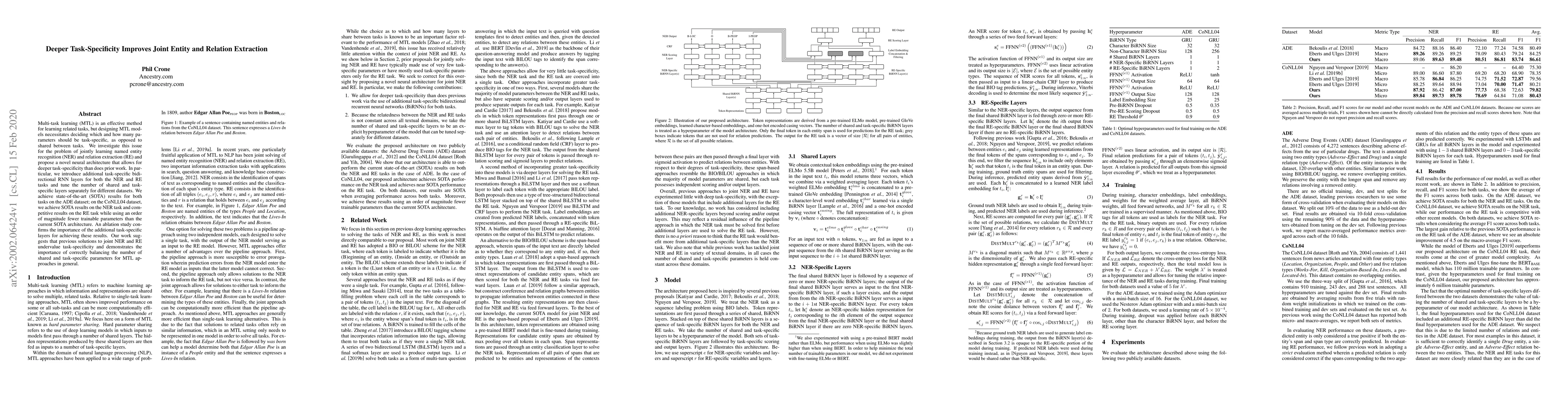 Multi-task learning (MTL) is an effective method for learning related tasks, but designing MTL models necessitates deciding which and how many parameters should be task-specific, as opposed to shared between tasks. We investigate this issue for the problem of jointly learning named entity recognition (NER) and relation extraction (RE) and propose a novel neural architecture that allows for deeper task-specificity than does prior work. In particular, we introduce additional task-specific bidirectional RNN layers for both the NER and RE tasks and tune the number of shared and task-specific layers separately for different datasets. We achieve state-of-the-art (SOTA) results for both tasks on the ADE dataset; on the CoNLL04 dataset, we achieve SOTA results on the NER task and competitive results on the RE task while using an order of magnitude fewer trainable parameters than the current SOTA architecture. An ablation study confirms the importance of the additional task-specific layers for achieving these results. Our work suggests that previous solutions to joint NER and RE undervalue task-specificity and demonstrates the importance of correctly balancing the number of shared and task-specific parameters for MTL approaches in general.