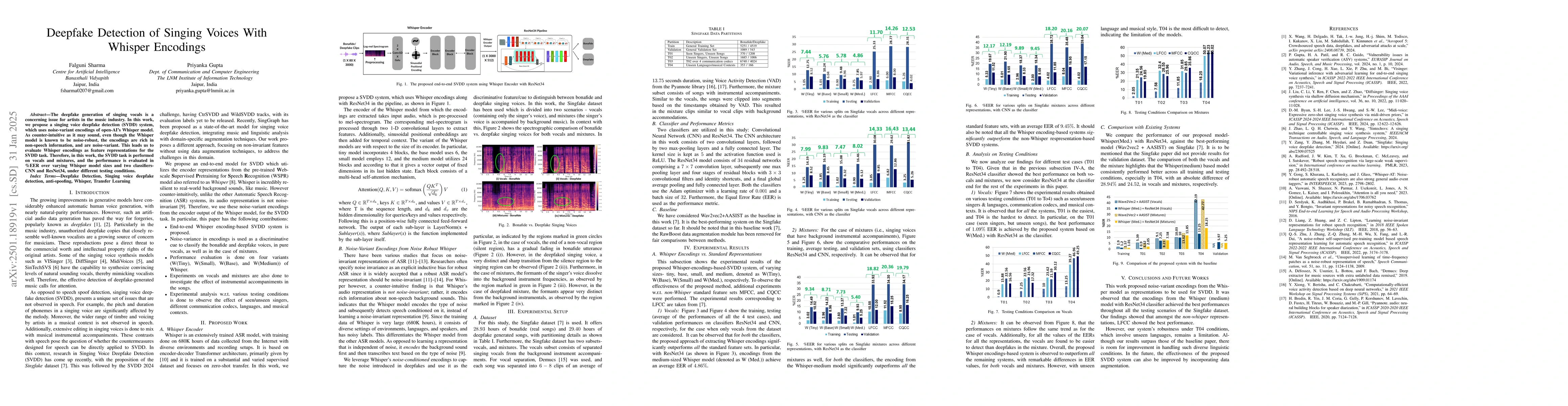 Unlike previous works focusing on noise-invariant representations, this research leverages Whisper's noise-conditioned encodings to capture the noise introduced in deepfakes, distinguishing between genuine and deepfake singing voices.