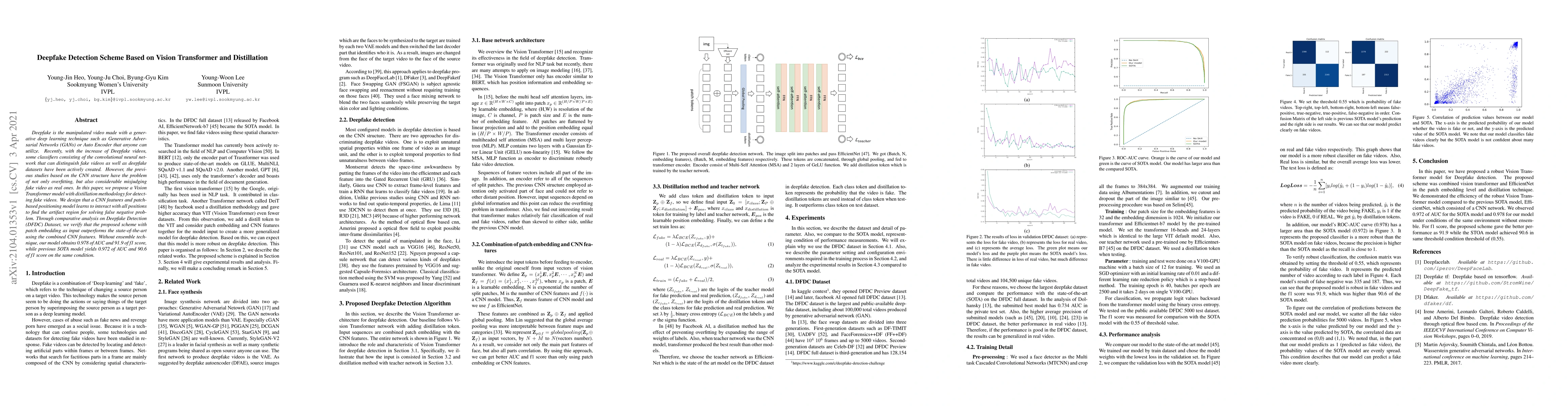 This research proposes a novel deepfake detection scheme utilizing a Vision Transformer model combined with distillation to improve accuracy. The proposed method addresses the limitations of previous CNN-based classifiers, achieving superior performance in detecting manipulated videos, as demonstrated by an AUC of 0.978 and an f1 score of 91.9 on the DFDC Dataset. For more details, please refer to the original paper.