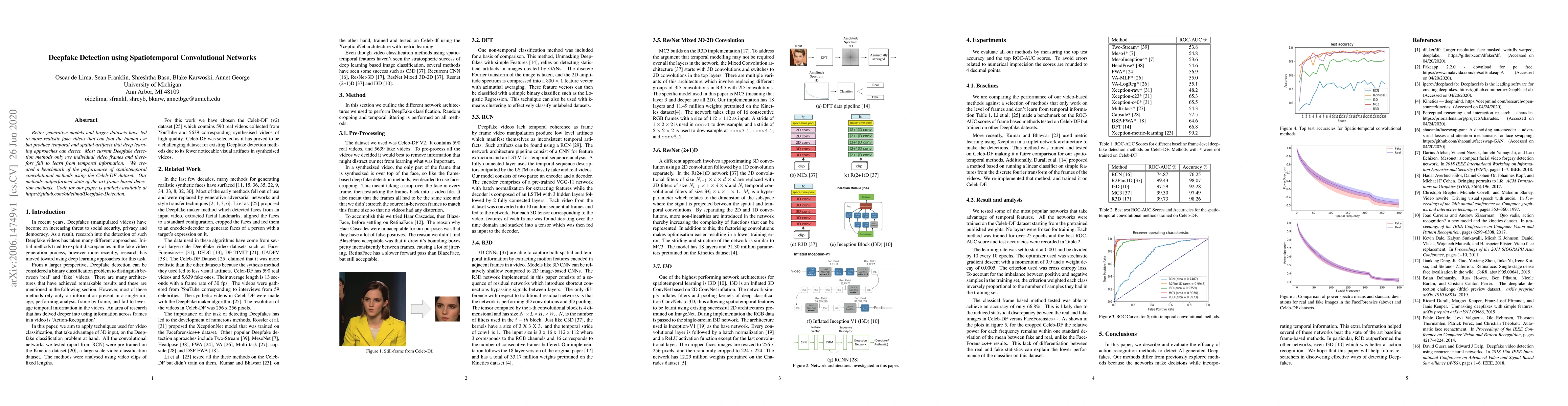 This paper proposes spatiotemporal convolutional networks for detecting deepfake videos, leveraging both spatial and temporal information to outperform frame-based methods. The study uses the Celeb-DF dataset to benchmark performance, achieving better results than current state-of-the-art techniques.